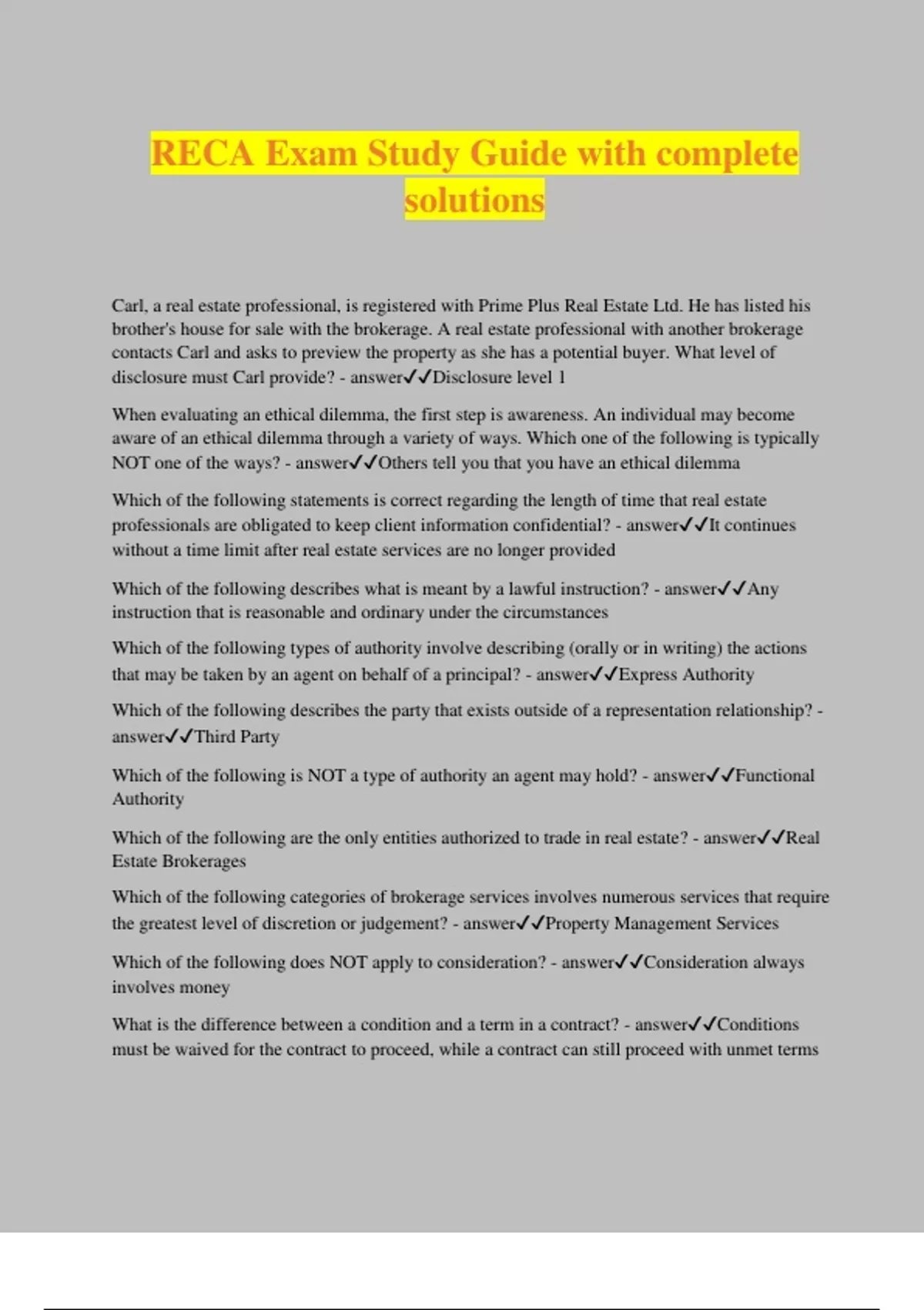 RECA Exam Study Guide with complete solutions Carl, a real estate professional, is registered with Prime Plus Real Estate Ltd. He has listed his brother's house for sale with the brokerage. A real estate professional with another brokerage contacts Carl and asks to preview the property as she has a potential buyer. What level of disclosure must Carl provide? - answerDisclosure level 1 When evaluating an ethical dilemma, the first step is awareness. An individual may become aware of an ethical dilemma through a variety of ways. Which one of the following is typically NOT one of the ways? - answerOthers tell you that you have an ethical dilemma Which of the following statements is correct regarding the length of time that real estate professionals are obligated to keep client information confidential? - answerIt continues without a time limit after real estate services are no longer provided Which of the following describes what is meant by a lawful instruction? - answerAny instruction that is reasonable and ordinary under the circumstances Which of the following types of authority involve describing (orally or in writing) the actions that may be taken by an agent on behalf of a principal? - answerExpress Authority Which of the following describes the party that exists outside of a representation relationship? - answerThird Party Which of the following is NOT a type of authority an agent may hold? - answerFunctional Authority Which of the following are the only entities authorized to trade in real estate? - answerReal Estate Brokerages Which of the following categories of brokerage services involves numerous services that require the greatest level of discretion or judgement? - answerProperty Management Services Which of the following does NOT apply to consideration? - answerConsideration always involves money What is the difference between a condition and a term in a contract? - answerConditions must be waived for the contract to proceed, while a contract can still proceed with unmet
