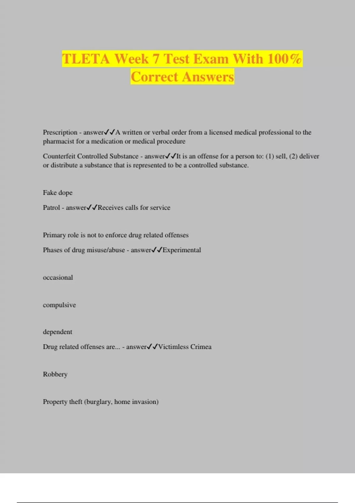 TLETA Week 7 Test Exam With 100% Correct Answers Prescription - answerA written or verbal order from a licensed medical professional to the pharmacist for a medication or medical procedure Counterfeit Controlled Substance - answerIt is an offense for a person to: (1) sell, (2) deliver or distribute a substance that is represented to be a controlled substance. Fake dope Patrol - answerReceives calls for service Primary role is not to enforce drug related offenses Phases of drug misuse/abuse - answerExperimental occasional compulsive dependent Drug related offenses are... - answerVictimless Crimea Robbery Property theft (burglary, home invasion) Murder (prostitution) What is the base for narcotics? - answerThe opium poppy GHB - answerGamma - Butyolactone Observed in urine 8-12 hours post ingestion Party/intoxication Date rape Body building Is kilogram a unit of measurement Americans use? How many pounds is 1 kilogram? - answerNo 2.2 pounds What is the drug schedule for marijuana in Tennessee? - answerSchedule IV (6) First responder to possible meth lab - answerCall trained personal What is the drug schedule for ecstasy in Tennessee? - answerSchedule 1 Examples of stress management strategies - answerdiet, exercise, relaxation, communication Give 3 physical signs or symptoms of stress - answerAll the above Identify 3 reactions of being involved in a critical incident - answerFatigue, poor concentration, anxiety Statistics show how many times officers get married on average - answer3 marriages The average officer lives how much shorter - answer14.9 years The biggest lie - answerExpressing your feelings shows weekeness The impact of second guessing
