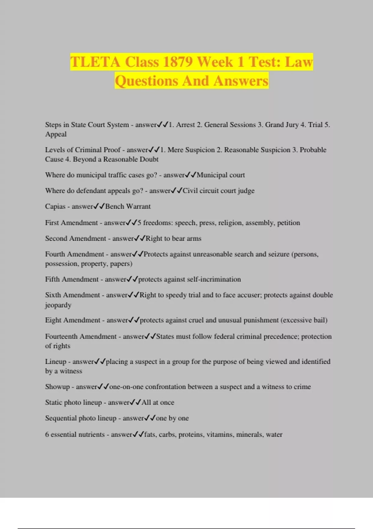 TLETA Class 1879 Week 1 Test: Law Questions And Answers Steps in State Court System - answer1. Arrest 2. General Sessions 3. Grand Jury 4. Trial 5. Appeal Levels of Criminal Proof - answer1. Mere Suspicion 2. Reasonable Suspicion 3. Probable Cause 4. Beyond a Reasonable Doubt Where do municipal traffic cases go? - answerMunicipal court Where do defendant appeals go? - answerCivil circuit court judge Capias - answerBench Warrant First Amendment - answer5 freedoms: speech, press, religion, assembly, petition Second Amendment - answerRight to bear arms Fourth Amendment - answerProtects against unreasonable search and seizure (persons, possession, property, papers) Fifth Amendment - answerprotects against self-incrimination Sixth Amendment - answerRight to speedy trial and to face accuser; protects against double jeopardy Eight Amendment - answerprotects against cruel and unusual punishment (excessive bail) Fourteenth Amendment - answerStates must follow federal criminal precedence; protection of rights Lineup - answerplacing a suspect in a group for the purpose of being viewed and identified by a witness Showup - answerone-on-one confrontation between a suspect and a witness to crime Static photo lineup - answerAll at once Sequential photo lineup - answerone by one 6 essential nutrients - answerfats, carbs, proteins, vitamins, minerals, water Function of proteins - answeressential for the growth, development, and repair of all body tissues Simple carbs - answersweetens food; fruits, soft drinks, candy Complex carbs - answergrains, legumes; include starches and most dietary fiber 2 groups of complex carbs - answerrefined and processed What percentage of your body does water make up? - answer50-60% Organic labels can be... - answerDeceivin