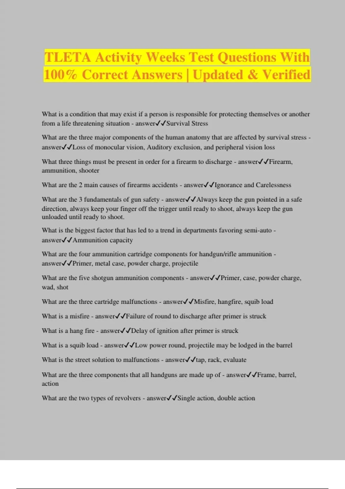 TLETA Activity Weeks Test Questions With 100% Correct Answers | Updated & Verified What is a condition that may exist if a person is responsible for protecting themselves or another from a life threatening situation - answerSurvival Stress What are the three major components of the human anatomy that are affected by survival stress - answerLoss of monocular vision, Auditory exclusion, and peripheral vision loss What three things must be present in order for a firearm to discharge - answerFirearm, ammunition, shooter What are the 2 main causes of firearms accidents - answerIgnorance and Carelessness What are the 3 fundamentals of gun safety - answerAlways keep the gun pointed in a safe direction, always keep your finger off the trigger until ready to shoot, always keep the gun unloaded until ready to shoot. What is the biggest factor that has led to a trend in departments favoring semi-auto - answerAmmunition capacity What are the four ammunition cartridge components for handgun/rifle ammunition - answerPrimer, metal case, powder charge, projectile What are the five shotgun ammunition components - answerPrimer, case, powder charge, wad, shot What are the three cartridge malfunctions - answerMisfire, hangfire, squib load What is a misfire - answerFailure of round to discharge after primer is struck What is a hang fire - answerDelay of ignition after primer is struck What is a squib load - answerLow power round, projectile may be lodged in the barrel What is the street solution to malfunctions - answertap, rack, evaluate What are the three components that all handguns are made up of - answerFrame, barrel, action What are the two types of revolvers - answerSingle action, double action What are the three types of semi-autos - answerSingle action, double action, double action only What are the four primary parts of a field stripped semi-auto - answerSpring, barrel, grip, slide What is the main advantage of the isosceles stance - answerMaximum use of body armor What are the 5 fundamentals of shooting - answerGrip, Stance, Breath Control, sight alignment, trigger control What is the maximum range for double ought buck according to the manufacturer - answer35 yards What is the maximum range for a 1 ounce slug according to the manufacturer - answer135 yards What are the four most common types of resistance - answerResistance during handcuffing, passive actions, resistance during escort, a