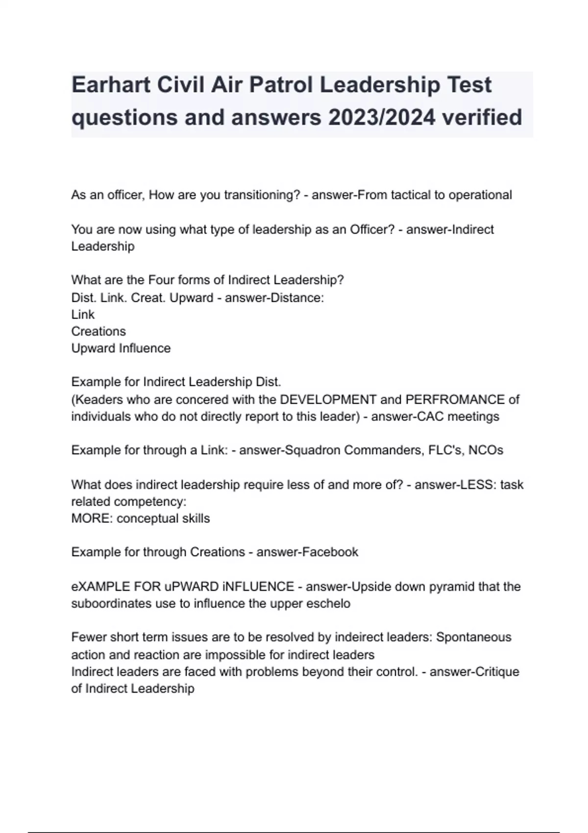 Earhart Civil Air Patrol Leadership Test questions and answers 2023/2024 verified