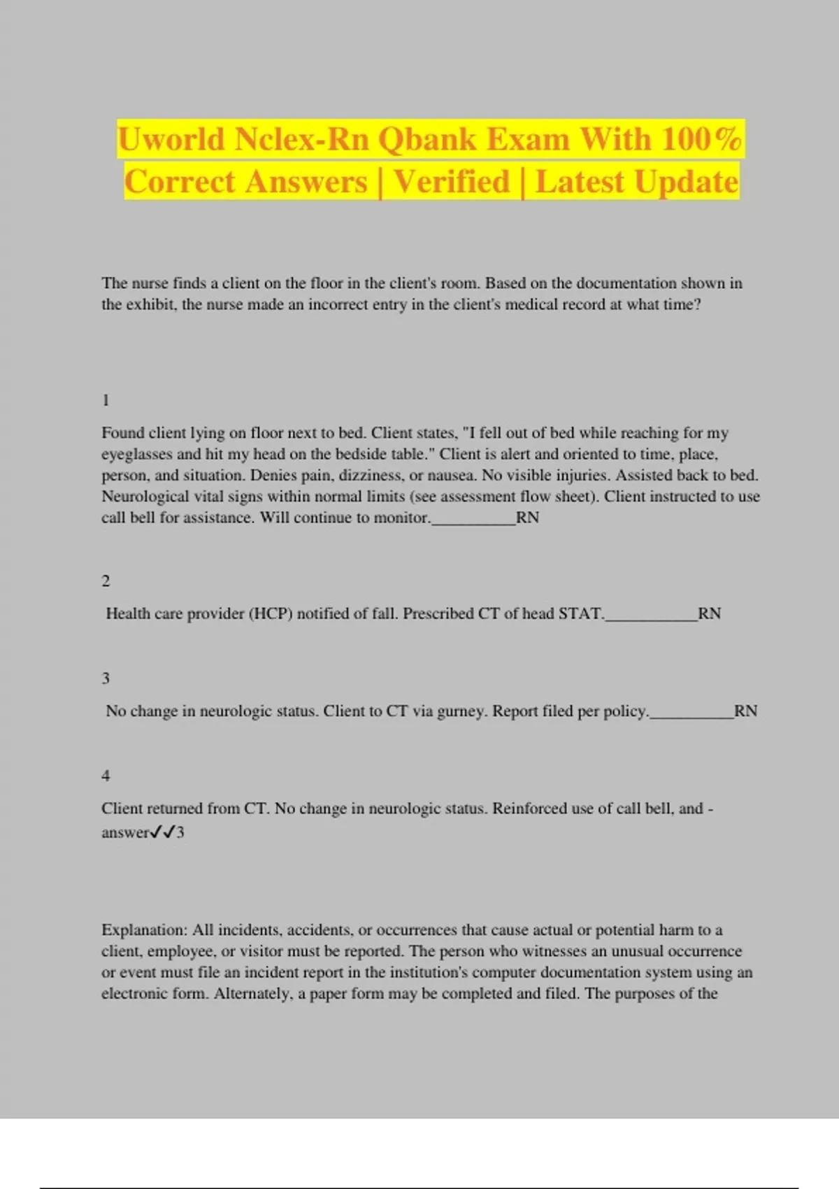 Uworld Nclex-Rn Qbank Exam With 100% Correct Answers | Verified | Latest Update The nurse finds a client on the floor in the client's room. Based on the documentation shown in the exhibit, the nurse made an incorrect entry in the client's medical record at what time? 1 Found client lying on floor next to bed. Client states, "I fell out of bed while reaching for my eyeglasses and hit my head on the bedside table." Client is alert and oriented to time, place, person, and situation. Denies pain, dizziness, or nausea. No visible injuries. Assisted back to bed. Neurological vital signs within normal limits (see assessment flow sheet). Client instructed to use call bell for assistance. Will continue to monitor.__________RN 2 Health care provider (HCP) notified of fall. Prescribed CT of head STAT.___________RN 3 No change in neurologic status. Client to CT via gurney. Report filed per policy.__________RN 4 Client returned from CT. No change in neurologic status. Reinforced use of call bell, and - answer3 Explanation: All incidents, accidents, or occurrences that cause actual or potential harm to a client, employee, or visitor must be reported. The person who witnesses an unusual occurrence or event must file an incident report in the institution's computer documentation system using an electronic form. Alternately, a paper form may be completed and filed. The purposes of the report are to inform risk management of the occurrence, allowing them to consider changes that might prevent similar incidents, and to notify administration of a potential litigation claim. The nurse should not document that an incident report was filed, or refer to the incident report in the medical record. Which clinical manifestations would the nurse identify with severe anorexia nervosa? Select all that apply. 1. Amenorrhea 2. Fluid and electrolyte imbalances 3. Heat intolerance 4. Presence of lanugo 5. Refusal to exercise 6. Weight loss of 25% below normal weight - answer1,2,4,6 Explanation: Anorexia nervosa is an eating disorder common among adolescents and young adults. Clinical manifestations of anorexia nervosa include: 1. Fear of weight gain - clients resort to self-induced vomiting, extensive dieting, and intense exercise resulting in excessive weight loss (<85% expected weight). Clients who self-induce vomiting may experience enlargement of the salivary glands and erosion of tooth enamel. 2. Fluid and electrolyte imbalance - excessive vomiting can cause hypokalemia and metabolic alkalosis 3. Amenorrhea - clients are often amenorrheic due to decreased body fat (low estrogen) 4. Decreased metabolic rate - severe weight loss results in hypotension, bradycardia, decreased body temperature, and cold intolerance 5. Lanugo (fine terminal hair) can be seen in extreme cases Manifestations of anorexia nervosa will resolve after the weight loss is corrected, although the recovery process can take several months. (Option 3) Anorexia nervosa manifests as cold intolerance. (Option 5) Anorexia nervosa manifests as lengthy and vigorous exercise. The nurse is helping to admit a client with malnutrition related to anorexia nervosa. Which actions are appropriate in the care of this client? Select all that apply. 1. Allow the client to continue to exercise per usual routine 2. Assist the client in reflection on triggers of disordered eating 3. Determine the client's required daily intake of calories 4. Encourage the client to keep a log of foods consumed 5. Monitor the client's weight at the same time each day - answer2,3,5 Explanation: Anorexia nervosa is a psycho