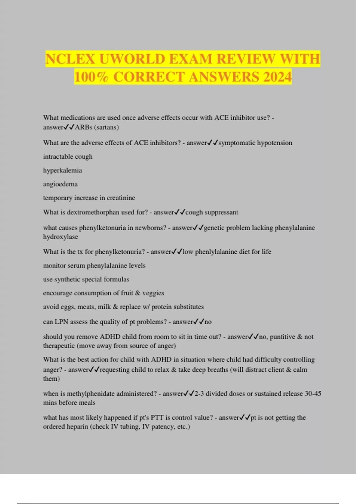 NCLEX UWORLD EXAM REVIEW WITH 100% CORRECT ANSWERS 2024 What medications are used once adverse effects occur with ACE inhibitor use? - answerARBs (sartans) What are the adverse effects of ACE inhibitors? - answersymptomatic hypotension intractable cough hyperkalemia angioedema temporary increase in creatinine What is dextromethorphan used for? - answercough suppressant what causes phenylketonuria in newborns? - answergenetic problem lacking phenylalanine hydroxylase What is the tx for phenylketonuria? - answerlow phenlylalanine diet for life monitor serum phenylalanine levels use synthetic special formulas encourage consumption of fruit & veggies avoid eggs, meats, milk & replace w/ protein substitutes can LPN assess the quality of pt problems? - answerno should you remove ADHD child from room to sit in time out? - answerno, puntitive & not therapeutic (move away from source of anger) What is the best action for child with ADHD in situation where child had difficulty controlling anger? - answerrequesting child to relax & take deep breaths (will distract client & calm them) when is methylphenidate administered? - answer2-3 divided doses or sustained release 30-45 mins before meals what has most likely happened if pt's PTT is control value? - answerpt is not getting the ordered heparin (check IV tubing, IV patency, etc.) How long is heparin effective? - answer2-6h can pts develop tolerance to heparin? - answerno does vitamin k effect heparin? - answerno low platelets while pt is receiving heparin places them at risk for? - answerheparin-induced thrombocytopenia (results in clot formation, not bleeding & has NO EFFECT on PTT) What is the priority tx for client with hemophilia A & suspected head injury? - answerIV factor VIII then head CT teaching about injury prevention s/sx of intracranial bleed are? - answerletharg