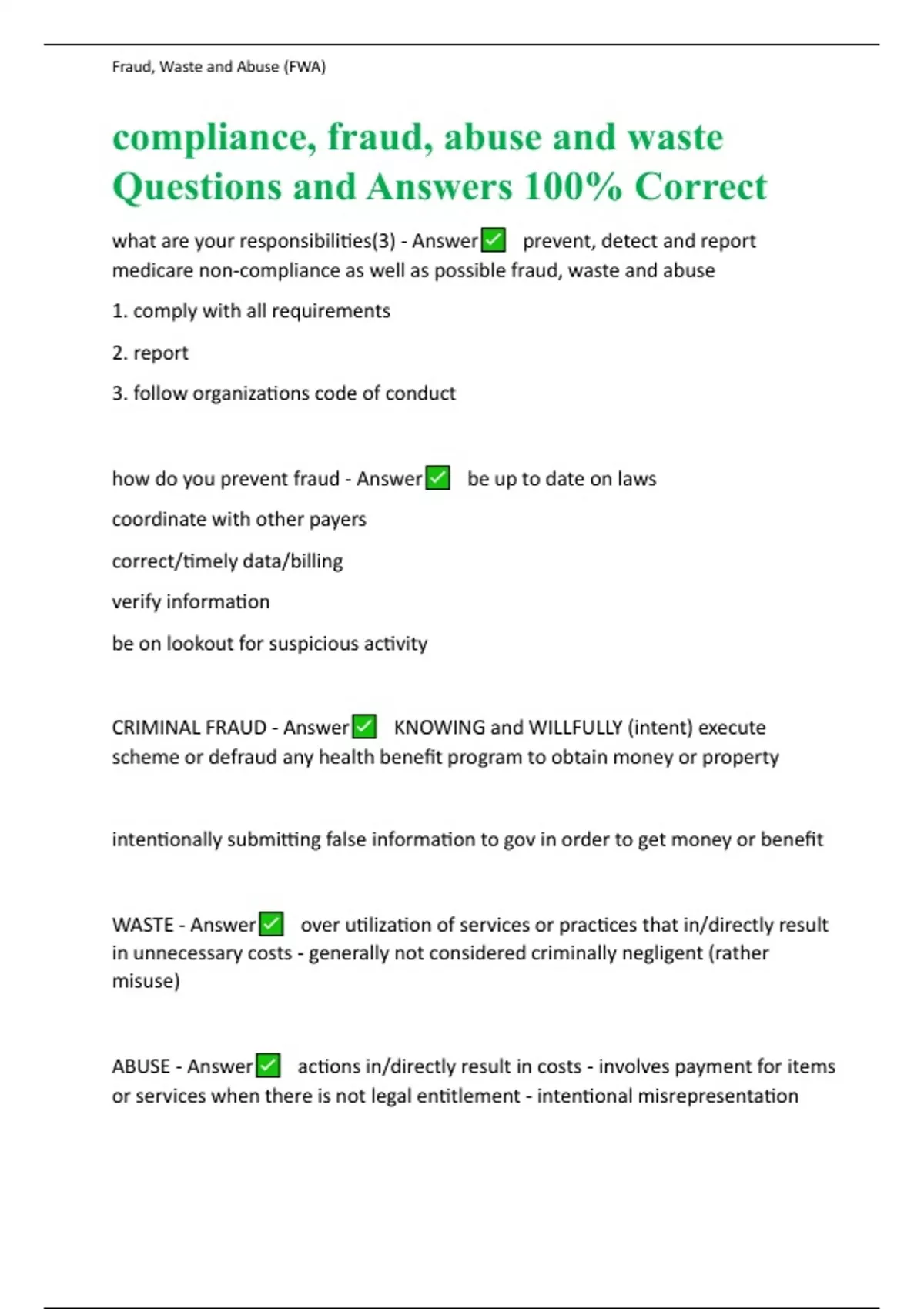 compliance, fraud, abuse and waste Questions and Answers 100% Correct