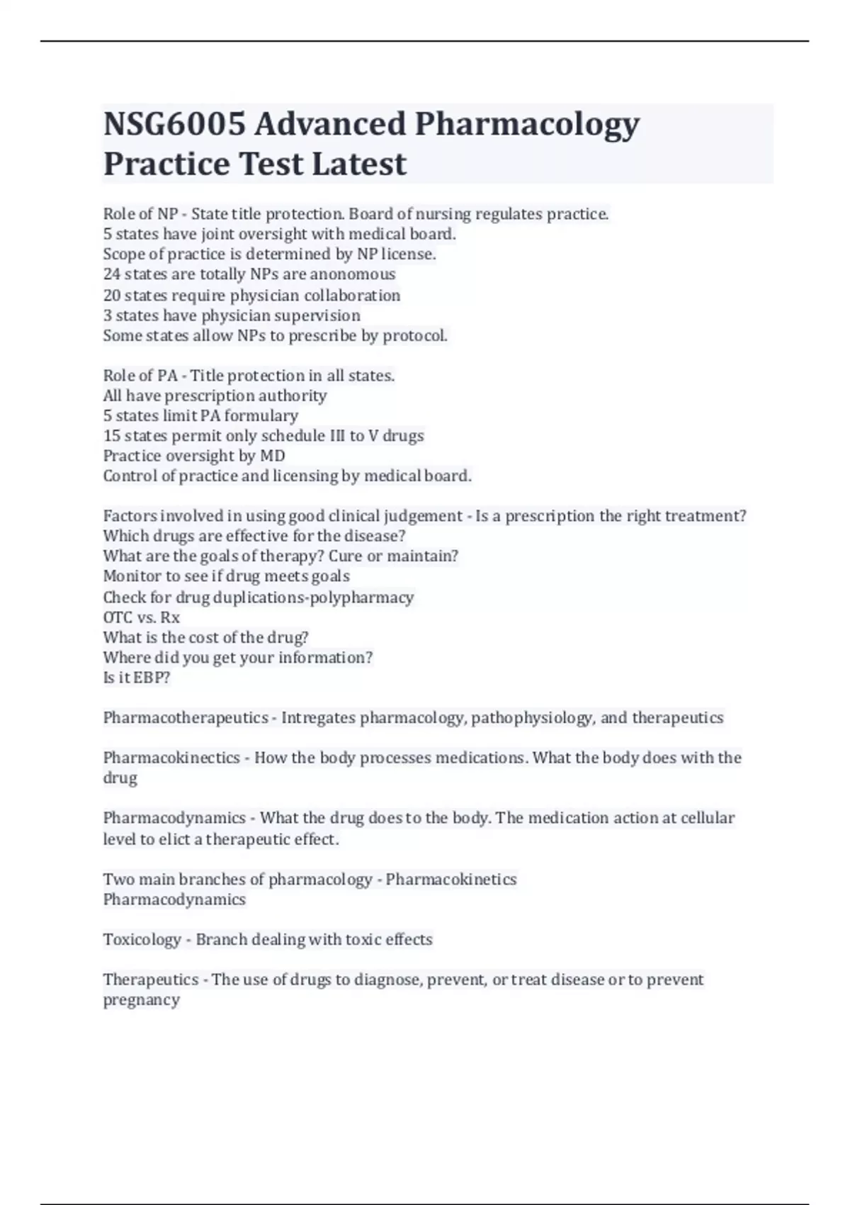NSG6005 Advanced Pharmacology Practice Test Latest Role of NP - State title protection. Board of nursing regulates practice. 5 states have joint oversight with medical board. Scope of practice is determined by NP license. 24 states are totally NPs are anonomous 20 states require physician collaboration 3 states have physician supervision Some states allow NPs to prescribe by protocol. Role of PA - Title protection in all states. All have prescription authority 5 states limit PA formulary 15 states permit only schedule III to V drugs Practice oversight by MD Control of practice and licensing by medical board. Factors involved in using good clinical judgement - Is a prescription the right treatment? Which drugs are effective for the disease? What are the goals of therapy? Cure or maintain? Monitor to see if drug meets goals Check for drug duplications-polypharmacy OTC vs. Rx What is the cost of the drug? Where did you get your information? Is it EBP? Pharmacotherapeutics - Intregates pharmacology, pathophysiology, and therapeutics Pharmacokinectics - How the body processes medications. What the body does with the drug Pharmacodynamics - What the drug does to the body. The medication action at cellular level to elict a therapeutic effect. Two main branches of pharmacology - Pharmacokinetics Pharmacodynamics Toxicology - Branch dealing with toxic effects Therapeutics - The use of drugs to diagnose, prevent, or treat disease or to prevent pregnancy 4 major processes of pharmacokinetics - Drug absorption into the bloodstream Drug distribution into the tissues to the site of action Drug metabolism via liver or intestinal enzymes Drug excretion via the kidneys in urine or intestine in feces Major processes of pharmacodynamics - Effects on the body Receptor binding and effect Drug effects on body-pharmacodynamics - Desired activity Undesirable effects Therapeutic window Duration of action Desired activity of a drug - Cellular membrane disruption Chemical reaction with downstream effects Interaction with enzyme, structural, and carrier proteins Interaction with ion channels Ligand binding to receptors