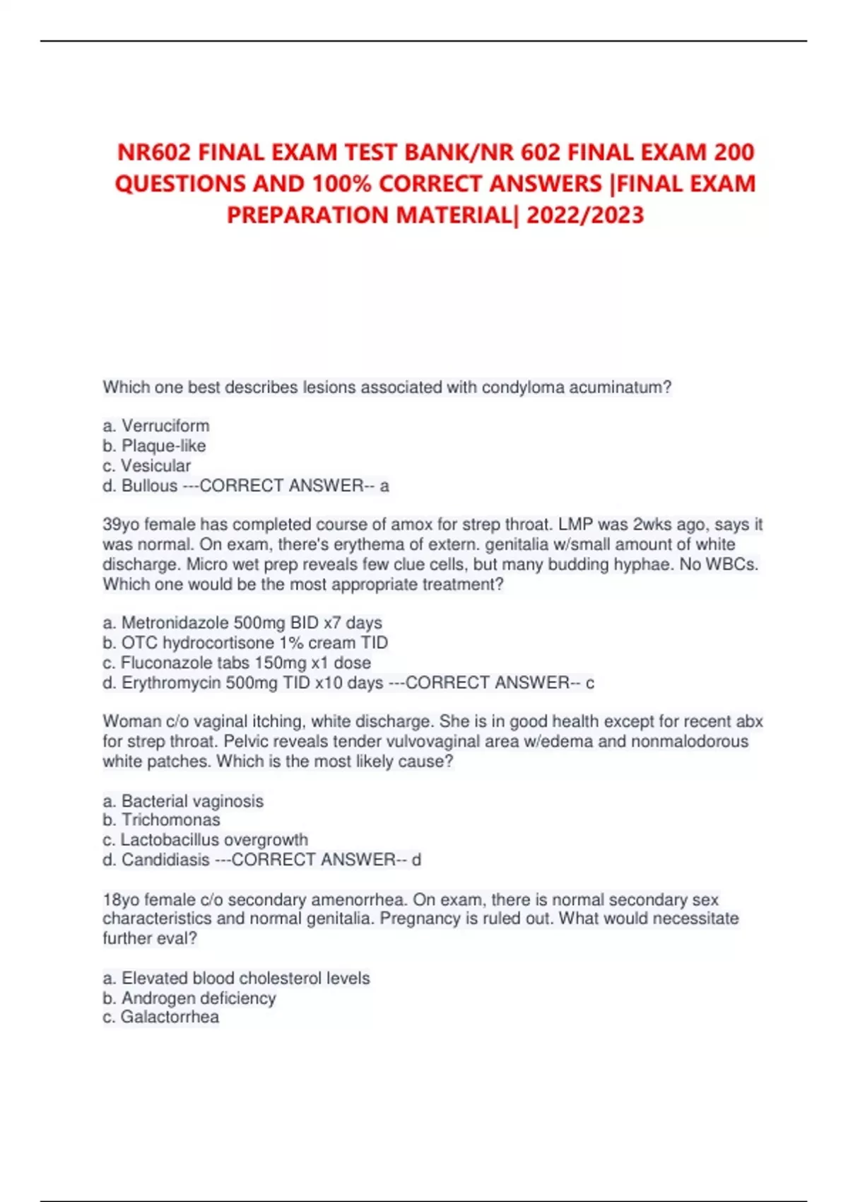 NR602 FINAL EXAM TEST BANK/NR 602 FINAL EXAM 200 QUESTIONS AND 100% CORRECT ANSWERS |FINAL EXAM PREPARATION MATERIAL| 2022/2023 Which one best describes lesions associated with condyloma acuminatum? a. Verruciform b. Plaque-like c. Vesicular d. Bullous ---CORRECT ANSWER-- a 39yo female has completed course of amox for strep throat. LMP was 2wks ago, says it was normal. On exam, there's erythema of extern. genitalia w/small amount of white discharge. Micro wet prep reveals few clue cells, but many budding hyphae. No WBCs. Which one would be the most appropriate treatment? a. Metronidazole 500mg BID x7 days b. OTC hydrocortisone 1% cream TID c. Fluconazole tabs 150mg x1 dose d. Erythromycin 500mg TID x10 days ---CORRECT ANSWER-- c Woman c/o vaginal itching, white discharge. She is in good health except for recent abx for strep throat. Pelvic reveals tender vulvovaginal area w/edema and nonmalodorous white patches. Which is the most likely cause? a. Bacterial vaginosis b. Trichomonas c. Lactobacillus overgrowth d. Candidiasis ---CORRECT ANSWER-- d 18yo female c/o secondary amenorrhea. On exam, there is normal secondary sex characteristics and normal genitalia. Pregnancy is ruled out. What would necessitate further eval? a. Elevated blood cholesterol levels b. Androgen deficiency c. Galactorrhea d. Hirsutism ---CORRECT ANSWER-- c 24yo female is dx'd w/primary dysmenorrhea. Which med would be used as first-line to help control symptoms? a. Antianxiety meds b. Progesterone-only contraception c. Oral steroids d. NSAIDs ---CORRECT ANSWER-- d Primary amenorrhea is best described as: a. Cessation of menstruation x6mo b. Failure of menstruation to occur by 17ho c. Failure of menstruation to occur by 13yo d. Cessation of menstruation x6mo after menarche ---CORRECT ANSWER-- c 25yo female c/o vaginal irritation and discharge. On exam, cervix is easily friable and erythematous. No adnexal tenderness. Wet prep reveals mobile protozoa on NS slide. This most likely represents: a. Trichomonas b. Mucopurulent cervicitis c. Bacterial vaginosis d. Gonorrhea ---CORRECT ANSWER-- a 16yo female has h/o secondary amenorrhea. Menarche at 10yo, regular cycles x2yrs, has not menstruated x4yrs. What is most frequent etiology of this problem? a. Eating disorder b. Pregnancy c. Anovulatory cycles d. Stress ---CORRECT ANSWER-- a Woman is experiencing vaginal discharge. Wet mount with KOH would be used to confirm: a. Herpes simplex b. Gonorrhea c. Candidiasis d. Chlamydia ---CORRECT ANSWER-- c Treatment options for condyloma acuminatum include: a. Imiquimod (Aldera) b. Azithromycin c. Acyclovir d. Metronidazole ---CORRECT ANSWER-- a 25yo postmenopausal female c/o pain in upper outer quadrant of L breast x1mo. Best course of action would be: a. Reassure pt that pain is often not presenting symptom of breast cancer. b. Teach pt breast self-exam. c. Order labs as most likely this is secondary to hormonal fluctuation d. Perform breast exam and order mammo ---CORRECT ANSWER-- d PID typically presents with all of the following except: a. Dysuria b. Leukopenia c. Cervical motion tenderness d. Abd pain ---CORRECT ANSWER-- b Which of the following are of a reproductive and pelvic origin? a. Salpingo-oophoritis (fallopian tube/ovary) secondary to PID b. Gynecologic malignancy c. Adhesions d. Myomata uteri ---CORRECT ANSWER-- a 25yo female c/o tender area near her introitus and to the L