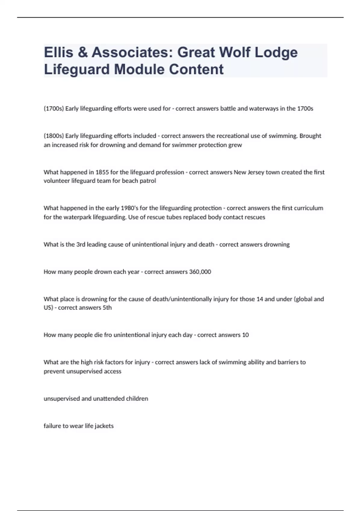 Ellis & Associates Great Wolf Lodge Lifeguard Module Content Question and answers 100% correct 2023/2024 (1700s) Early lifeguarding efforts were used for - correct answers battle and waterways in the 1700s (1800s) Early lifeguarding efforts included - correct answers the recreational use of swimming. Brought an increased risk for drowning and demand for swimmer protection grew What happened in 1855 for the lifeguard profession - correct answers New Jersey town created the first volunteer lifeguard team for beach patrol What happened in the early 1980's for the lifeguarding protection - correct answers the first curriculum for the waterpark lifeguarding. Use of rescue tubes replaced body contact rescues What is the 3rd leading cause of unintentional injury and death - correct answers drowning How many people drown each year - correct answers 360,000 What place is drowning for the cause of death/unintentionally injury for those 14 and under (global and US) - correct answers 5th How many people die f