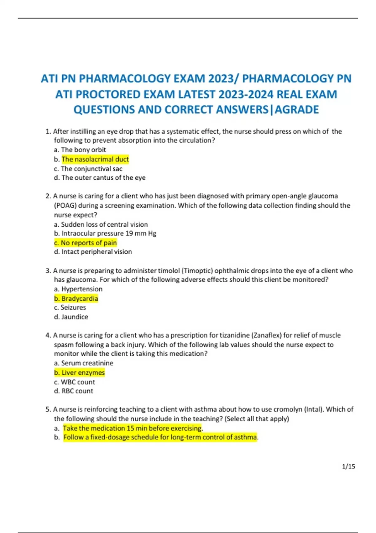 ATI PN PHARMACOLOGY EXAM 2023/ PHARMACOLOGY PN ATI PROCTORED EXAM LATEST REAL EXAM QUESTIONS AND CORRECT ANSWERS|AGRADE 1. After instilling an eye drop that has a systematic effect, the nurse should press on which of the following to prevent absorption into the circulation? a. The bony orbit b. The nasolacrimal duct c. The conjunctival sac d. The outer cantus of the eye 2. A nurse is caring for a client who has just been diagnosed with primary open-angle glaucoma (POAG) during a screening examination. Which of the following data collection finding should the nurse expect? a. Sudden loss of central vision b. Intraocular pressure 19 mm Hg c. No reports of pain d. Intact peripheral vision 3. A nurse is preparing to administer timolol (Timoptic) ophthalmic drops into the eye of a client who has glaucoma. For which of the following adverse effects should this client be monitored? a. Hypertension b. Bradycardia c. Seizures d. Jaundice 4. A nurse is caring for a client who has a prescription for tizanidine (Zanaflex) for relief of muscle spasm following a back injury. Which of the following lab values should the nurse expect to monitor while the client is taking this medication? a. Serum creatinine b. Liver enzymes c. WBC count d. RBC count 5. A nurse is reinforcing teaching to a client with asthma about how to use cromolyn (Intal). Which of the following should the nurse include in the teaching? (Select all that apply) a. Take the medication 15 min before exercising. b. Follow a fixed-dosage schedule for long-term control of asthma. 2/15 c. Expect to lose weight while taking the medication. d. Observe for adverse effects such astremors, restlessness, and palpitations. e. Do not crush or chew tablets. 6. A nurse is reinforcing teaching for a client with a prescription for a beclomethasone (QVAR) inhaler to be used for the long-term management of asthma. Which of the following dietary supplements should the client be sure to consume in sufficient amounts to prevent a deficiency while taking the QVAR inhaler? a. Iron and Protein b. Calcium and Vitamin D c. Vitamin B¹² and folic acid d. Vitamin E and K 7. A nurse is caring for a client who is prescribed oral prednisone (Deltasone) for the treatment of chronic asthma. The nurse should plan to monitor the client for which of the following findings? a. Weight loss b. Infection c. Hypoglycemia d. Angina Pain 8. A nurse is caring for a client who states she has been taking phenylephrine (Neo-Synephrine) nasal drops for the past 10 days for her upper respiratory symptoms. The nurse should plan to monitor the client for which of the following findings? a. Sedation b. Nasal congestion c. Productive cough d. Constipation 9. A nurse is caring for a preschool-age child who may have taken an overdose of diphenhydramine (Benadryl). To identify antihistamine toxicity, the nurse should plan to monitor the child for which of the following? a. Hallucinations b. Bradycardia c. Pinpoint pupils d. Pallor 10. A nurse is reinforcing teaching for a client who has hypertension and is prescribed hydrochlorothiazide (HydroDIURIL) twice daily. Which of the following instructions should the nurse include in the client’s teaching? a. “You should avoid foods high in potassium.” b. “Take the second dose of the day by early afternoon.” c. “Watch for ankle swelling that may appear late in the evening.” d. “Limit your daily fluid intake to 1½ L.” 3/15 11. A client has a new prescription forspironolactone (Aldactone). Which of the following laboratory values should the nurse recognize as a reason to withhold the morning dose of the medication and notify the provider? a. Serum sodium 138 mEq/L b. Serum potassium 5.2 mEq/L c. Serum creatinine 1.2 mEq/L d. Serum chloride 106 mEq/L 12. A nurse is caring for a client who is prescribed daily doses of both digoxin (Lanoxin) and furosemide (Lasix). The client’s potassium level is 3.2 mEq/L. For which of the following medication interaction is the client at risk? a. Toxic levels of furosemide b. Toxic levels of digoxin c. Sub-therapeutic levels of furosemide d. Sub-therapeutic levels of digoxin 13. Propranolol (Inderal) is contraindicated for a client who has which of the following conditions? a. Asthma b. Diabetes c. Angina d. Dementia 14. A nurse is reinforcing teaching for a client who has a prescription for verapamil (Calan). Which of the following statements by the clients indicates a need for further teaching? a. “I should increase the amount of fiber in my diet since the medication causes constipation.” b. “I should eliminate grapefruit juice from my diet while taking verapamil.” c. “I should decrease the amount of calcium in my diet while taking the medication.” d. I should take the medication with food if it causes an upset stomach.”
