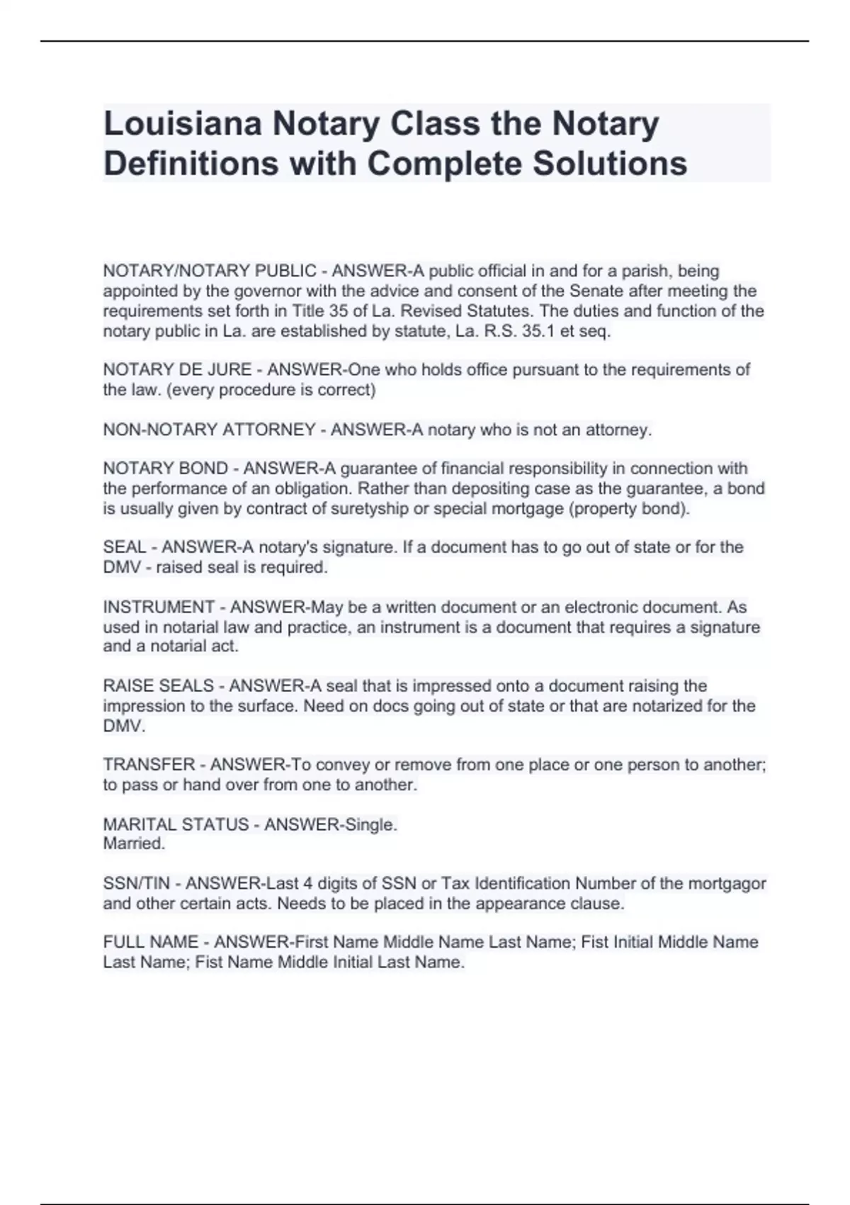Louisiana Notary Class the Notary Definitions with Complete SolutionsLouisiana Notary Class the Notary Definitions with Complete SolutionsLouisiana Notary Class the Notary Definitions with Complete SolutionsNOTARY/NOTARY PUBLIC - ANSWER-A public official in and for a parish, being appointed by the governor with the advice and consent of the Senate after meeting the requirements set forth in Title 35 of La. Revised Statutes. The duties and function of the notary public in La. are established by statute, La. R.S. 35.1 et seq. NOTARY DE JURE - ANSWER-One who holds office pursuant to the requirements of the law. (every procedure is correct) NON-NOTARY ATTORNEY - ANSWER-A notary who is not an attorney. NOTARY BOND - ANSWER-A guarantee of financial responsibility in connection with the performance of an obligation. Rather than depositing case as the guarantee, a bond is usually given by contract of suretyship or special mortgage (property bond).