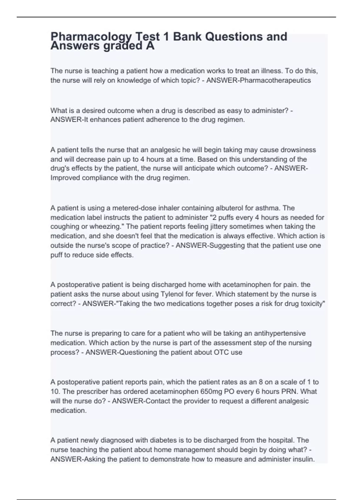 he nurse is teaching a patient how a medication works to treat an illness. To do this, the nurse will rely on knowledge of which topic? - ANSWER-Pharmacotherapeutics What is a desired outcome when a drug is described as easy to administer? - ANSWER-It enhances patient adherence to the drug regimen. A patient tells the nurse that an analgesic he will begin taking may cause drowsiness and will decrease pain up to 4 hours at a time. Based on this understanding of the drug's effects by the patient, the nurse will anticipate which outcome? - ANSWER-Improved compliance with the drug regimen. A patient is using a metered-dose inhaler containing albuterol for asthma. The medication label instructs the patient to administer "2 puffs every 4 hours as needed for coughing or wheezing." The patient reports feeling jittery sometimes when taking the medication, and she doesn't feel that the medication is always effective. Which action is outside the nurse's scope of practice? - ANSWER-Suggesting that the patient use one puff to reduce side effects. A postoperative patient is being discharged home with acetaminophen for pain. the patient asks the nurse about using Tylenol for fever. Which statement by the nurse is correct? - ANSWER-"Taking the two medications together poses a risk for drug toxicity" The nurse is preparing to care for a patient who will be taking an antihypertensive medication. Which action by the nurse is part of the assessment step of the nursing process? - ANSWER-Questioning the patient about OTC use A postoperative patient reports pain, which the patient rates as an 8 on a scale of 1 to 10. The prescriber has ordered acetaminophen 650mg PO every 6 hours PRN. What will the nurse do? - ANSWER-Contact the provider to request a different analgesic medication.