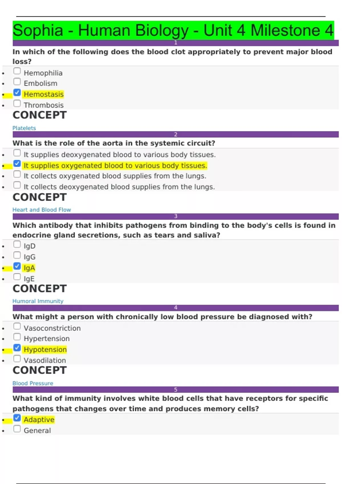 In which of the following does the blood clot appropriately to prevent major blood loss? • Hemophilia • Embolism • Hemostasis • Thrombosis CONCEPT Platelets 2 What is the role of the aorta in the systemic circuit? • It supplies deoxygenated blood to various body tissues. • It supplies oxygenated blood to various body tissues. • It collects oxygenated blood supplies from the lungs. • It collects deoxygenated blood supplies from the lungs. CONCEPT Heart and Blood Flow 3 Which antibody that inhibits pathogens from binding to the body's cells is found in endocrine gland secretions, such as tears and saliva? • IgD • IgG • IgA • IgE CONCEPT Humoral Immunity 4 What might a person with chronically low blood pressure be diagnosed with? • Vasoconstriction • Hypertension • Hypotension • Vasodilation CONCEPT Blood Pressure 5 What kind of immunity involves white blood cells that have receptors for specific pathogens that changes over time and produces memory cells? • Adaptive • General • Pathogenic • Innate CONCEPT Pathogens 6 Which type of white blood cell attacks other unhealthy cells? • Monocytes • Eosinophils • Basophils • Lymphocytes CONCEPT White Blood Cells 7 What are the antibodies found in blood type B? • Anti-B • Neither anti-A nor anti-B • Anti-A and Anti-B • Anti-A CONCEPT Blood Types 8 If a transplanted organ's MHC cells don't match those of the recipient, what will happen? • The organ will change its MHC cells so as to be recognized by the recipient's immune system. • The recipient's body will block off the new organ and it won't function normally. • The recipient's immune system will change the MHC markers on the organ so that it won't be identified as an intruder. • The recipient's immune system will identify the transplanted organ as an intruder and attack it. CONCEPT Organ Transplant and Immunotherapy 9 Which of the following statements about vaccines is true? • A vaccine prompts the body's T-cells to produce antibodies against the virus. • Vaccines are non-specific, meaning they protect against a variety of viruses or illnesses. • Booster shots are a type of secondary vaccine that allow for longer lasting protection against a particular virus. • Vaccines are used against viruses, bacteria and fungal infections. CONCEPT Vaccines 10 What muscular tubes, not supported by cartilage, help regulate airflow into and out of the lungs? • Diaphragm