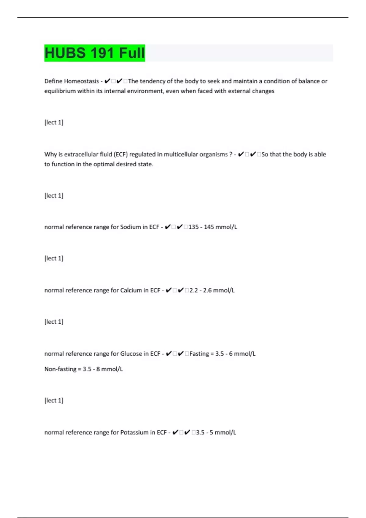 Define Homeostasis - ️️The tendency of the body to seek and maintain a condition of balance or equilibrium within its internal environment, even when faced with external changes [lect 1] Why is extracellular fluid (ECF) regulated in multicellular organisms ? - ️️So that the body is able to function in the optimal desired state. [lect 1] normal reference range for Sodium in ECF - ️️135 - 145 mmol/L [lect 1] normal reference range for Calcium in ECF - ️️2.2 - 2.6 mmol/L [lect 1] normal reference range for Glucose in ECF - ️️Fasting = 3.5 - 6 mmol/L Non-fasting = 3.5 - 8 mmol/L [lect 1] normal reference range for Potassium in ECF - ️️3.5 - 5 mmol/L [lect 1]