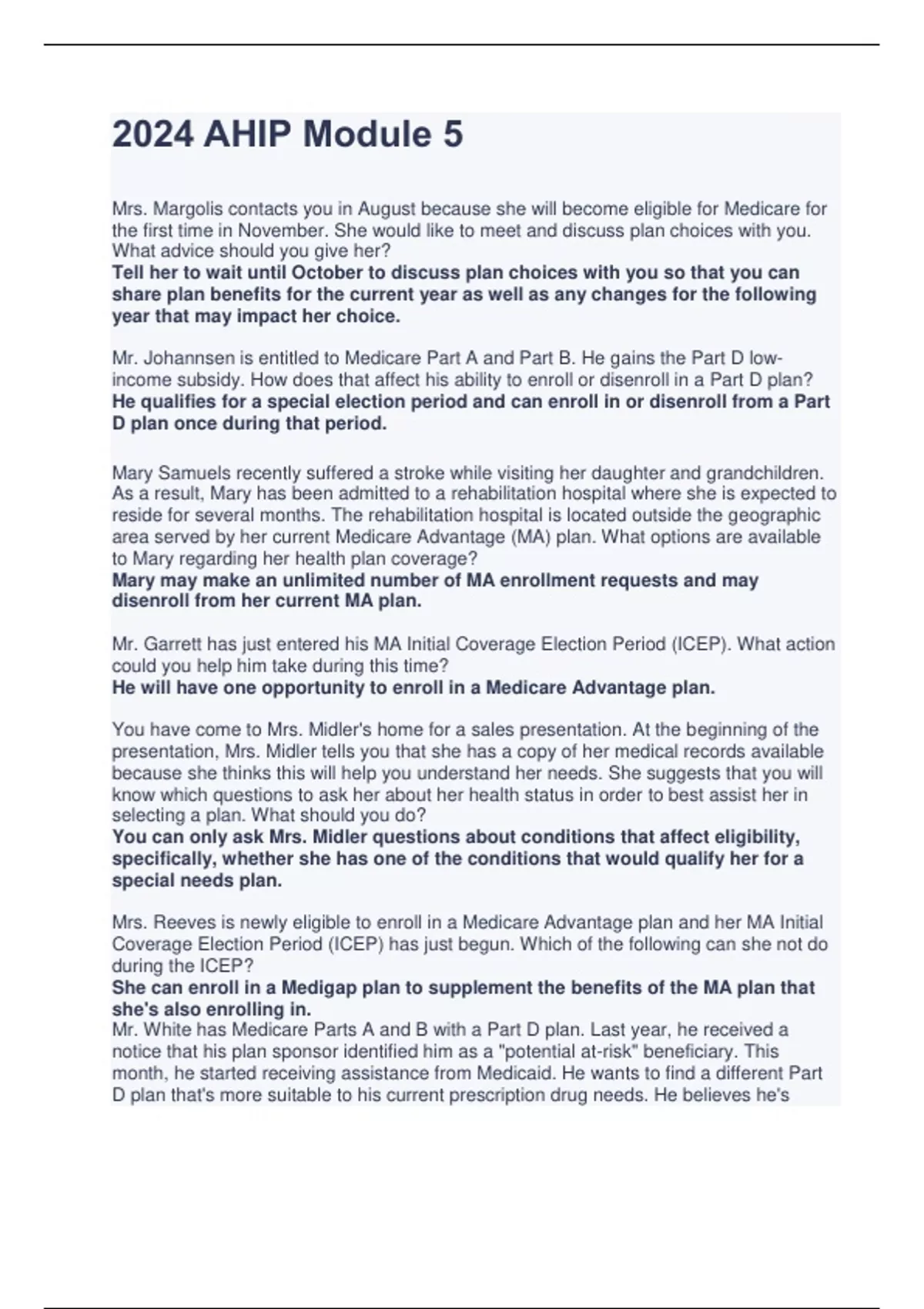 2024 AHIP Module 5 Mrs. Margolis contacts you in August because she will become eligible for Medicare for the first time in November. She would like to meet and discuss plan choices with you. What advice should you give her? Tell her to wait until October to discuss plan choices with you so that you can share plan benefits for the current year as well as any changes for the following year that may impact her choice. Mr. Johannsen is entitled to Medicare Part A and Part B. He gains the Part D lowincome subsidy. How does that affect his ability to enroll or disenroll in a Part D plan? He qualifies for a special election period and can enroll in or disenroll from a Part D plan once during that period. Mary Samuels recently suffered a stroke while visiting her daughter and grandchildren. As a result, Mary has been admitted to a rehabilitation hospital where she is expected to reside for several months. The rehabilitation hospital is located outside the geographic area served by her current Medicare Advantage (MA) plan. What options are available to Mary regarding her health plan coverage? Mary may make an unlimited number of MA enrollment requests and may disenroll from her current MA plan. Mr. Garrett has just entered his MA Initial Coverage Election Period (ICEP). What action could you help him take during this time? He will have one opportunity to enroll in a Medicare Advantage plan. You have come to Mrs. Midler's home for a sales presentation. At the beginning of the presentation, Mrs. Midler tells you that she has a copy of her medical records available because she thinks this will help you understand her needs. She suggests that you will know which questions to ask her about her health status in order to best assist her in selecting a plan. What should you do? You can only ask Mrs. Midler questions about conditions that affect eligibility, specifically, whether she has one of the conditions that would qualify her for a special needs plan.