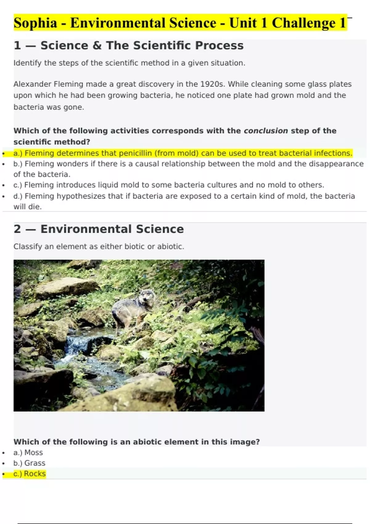 Sophia - Environmental Science - Unit 1 Challenge 1 1 — Science & The Scientific Process Identify the steps of the scientific method in a given situation. Alexander Fleming made a great discovery in the 1920s. While cleaning some glass plates upon which he had been growing bacteria, he noticed one plate had grown mold and the bacteria was gone. Which of the following activities corresponds with the conclusion step of the scientific method? • a.) Fleming determines that penicillin (from mold) can be used to treat bacterial infections. • b.) Fleming wonders if there is a causal relationship between the mold and the disappearance of the bacteria. • c.) Fleming introduces liquid mold to some bacteria cultures and no mold to others. • d.) Fleming hypothesizes that if bacteria are exposed to a certain kind of mold, the bacteria will die. 2 — Environmental Science Classify an element as either biotic or abiotic. Which of the following is an abiotic element in this image? • a.) Moss • b.) Grass • c.) Rocks • d.) Plants 3 — Environmentalism: Environmentalism vs. Environmental Science