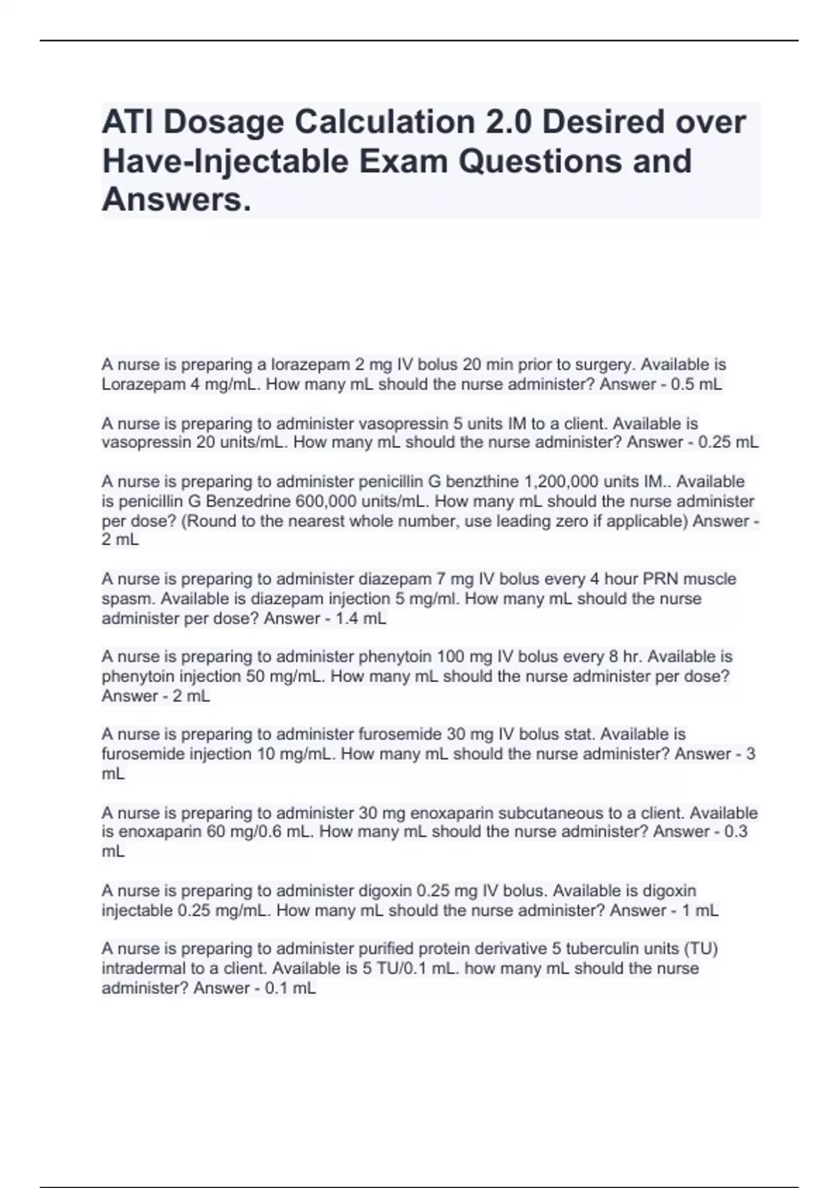 ATI Dosage Calculation 2.0 Desired over Have-Injectable Exam Questions and Answers.