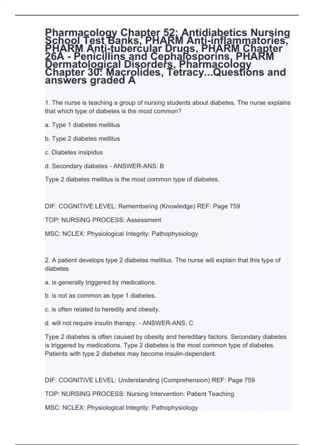 . The nurse is teaching a group of nursing students about diabetes. The nurse explains that which type of diabetes is the most common? a. Type 1 diabetes mellitus b. Type 2 diabetes mellitus c. Diabetes insipidus d. Secondary diabetes - ANSWER-ANS: B Type 2 diabetes mellitus is the most common type of diabetes. DIF: COGNITIVE LEVEL: Remembering (Knowledge) REF: Page 759 TOP: NURSING PROCESS: Assessment MSC: NCLEX: Physiological Integrity: Pathophysiology 2. A patient develops type 2 diabetes mellitus. The nurse will explain that this type of diabetes a. is generally triggered by medications. b. is not as common as type 1 diabetes. c. is often related to heredity and obesity. d. will not require insulin therapy. - ANSWER-ANS: C Type 2 diabetes is often caused by obesity and hereditary factors. Secondary diabetes is triggered by medications. Type 2 diabetes is the most common type of diabetes. Patients with type 2 diabetes may become insulin-dependent. DIF: COGNITIVE LEVEL: Understanding (Comprehension) REF: Page 759 TOP: NURSING PROCESS: Nursing Intervention: Patient Teaching MSC: NCLEX: Physiological Integrity: Pathophysiology