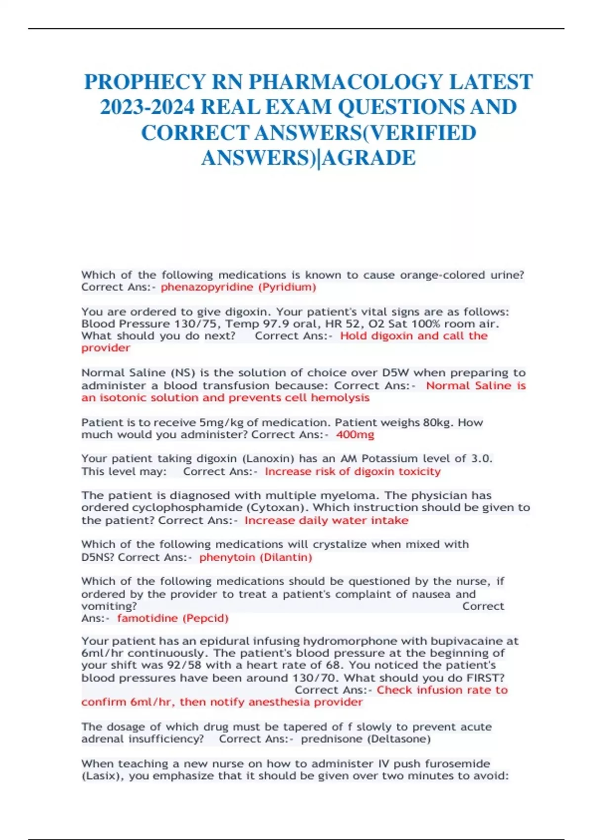 PROPHECY RN PHARMACOLOGY LATEST REAL EXAM QUESTIONS AND CORRECT ANSWERS(VERIFIED ANSWERS)|AGRADE Which of the following medications is known to cause orange-colored urine? Correct Ans:- phenazopyridine (Pyridium) You are ordered to give digoxin. Your patient's vital signs are as follows: Blood Pressure 130/75, Temp 97.9 oral, HR 52, O2 Sat 100% room air. What should you do next? Correct Ans:- Hold digoxin and call the provider Normal Saline (NS) is the solution of choice over D5W when preparing to administer a blood transfusion because: Correct Ans:- Normal Saline is an isotonic solution and prevents cell hemolysis Patient is to receive 5mg/kg of medication. Patient weighs 80kg. How much would you administer? Correct Ans:- 400mg Your patient taking digoxin (Lanoxin) has an AM Potassium level of 3.0. This level may: Correct Ans:- Increase risk of digoxin toxicity The patient is diagnosed with multiple myeloma. The physician has ordered cyclophosphamide (Cytoxan). Which instruction should be given to the patient? Correct Ans:- Increase daily water intake Which of the following medications will crystalize when mixed with D5NS? Correct Ans:- phenytoin (Dilantin) Which of the following medications should be questioned by the nurse, if ordered by the provider to treat a patient's complaint of nausea and Ans:- famotidine (Pepcid) Your patient has an epidural infusing hydromorphone with bupivacaine at 6ml/hr continuously. The patient's blood pressure at the beginning of your shift was 92/58 with a heart rate of 68. You noticed the patient's blood pressures have been around 130/70. What should you do FIRST? Correct Ans:- Check infusion rate to confirm 6ml/hr, then notify anesthesia provider The dosage of which drug must be tapered of f slowly to prevent acute adrenal insufficiency? Correct Ans:- prednisone (Deltasone) When teaching a new nurse on how to administer IV push furosemide (Lasix), you emphasize that it should be given over two minutes to avoid: vomiting? Correct tinnitus Correct Ans: - the patient's serum calcium level is 13mg/dl. Which medication should the nurse prepare to administer as prescribed to the patient? Correct Ans:- calcintonin (Miacalcin) A patient has a prescription to take Guaifenesin (Mucinex) every 4 hours, as needed. The nurse determines that the patient understands the MOST effective use of the medication if the patient states that he or she will: the medication with a full glass of water Acetylsalicylic acid (Aspirin) has which of the following pharmacological effects? Correct Ans:- Anti-inflammatory, anti-pyretic, decrease platelet aggregation Your patient is to receive 2 G vancomycin over 2 hours. The medication comes in from the pharmacy as 2 G Vancomycin in 250ml normal saline. At what rate will the IV medication run? Correct Ans:- 125ml/hr Sildenafil (Viagra) is prescribed to treat a patient with erectile dysfunction. A nurse reviews the patient's medical record and would question the prescription if which of the following is noted in the history? Correct Ans:- Use of nitroglycerin While delivering the lunch tray of a patient who is taking warfarin (Coumadin), the nurse notices diversity of food items. Which of the following foods would be a concern? Correct Ans:- Spinach Your patient is receiving vancomycin (Vancocin) 500mg IV every 12 hours. As a nurse, you understand that the PRIMARY rationale for monitoring serum levels of vancomycin is that: Correct Ans:- It can cause nephrotoxicity Convert 1.2 milligrams to micrograms Correct Ans:- 1200 mcg You are caring for a patient with diabetes. Humalog insulin is ordered via sliding scale AC and HS. When is the best time to administer Humalog insulin? Correct Ans:- 15 minutes before meal arrives