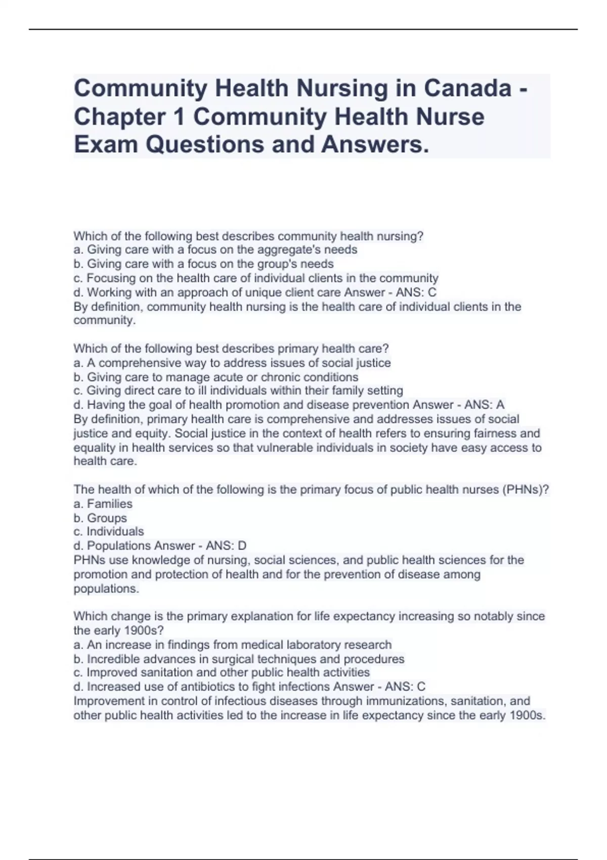Community Health Nursing in Canada - Chapter 1 Community Health Nurse Exam Questions