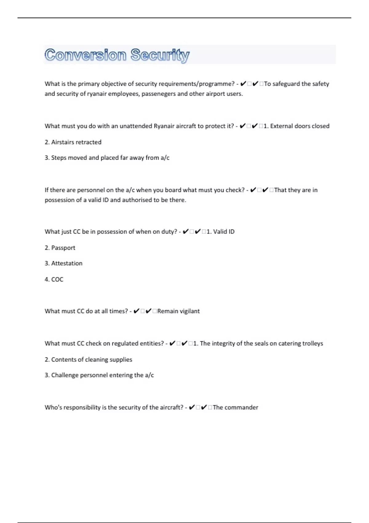 What is the primary objective of security requirements/programme? - ️️To safeguard the safety and security of ryanair employees, passenegers and other airport users. What must you do with an unattended Ryanair aircraft to protect it? - ️️1. External doors closed 2. Airstairs retracted 3. Steps moved and placed far away from a/c If there are personnel on the a/c when you board what must you check? - ️️That they are in possession of a valid ID and authorised to be there. What just CC be in possession of when on duty? - ️️1. Valid ID 2. Passport 3. Attestation 4. COC What must CC do at all times? - ️️Remain vigilant What must CC check on regulated entities? - ️️1. The integrity of the seals on catering trolleys 2. Contents of cleaning supplies 3. Challenge personnel entering the a/c Who's responsibility is the security of the aircraft? - ️️The commander