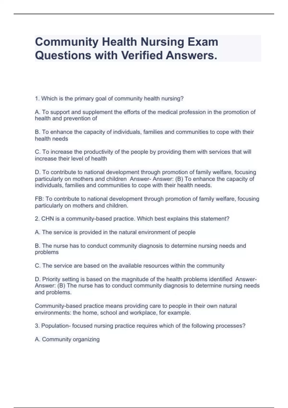 Community Health Nursing Exam Questions with Verified Answers