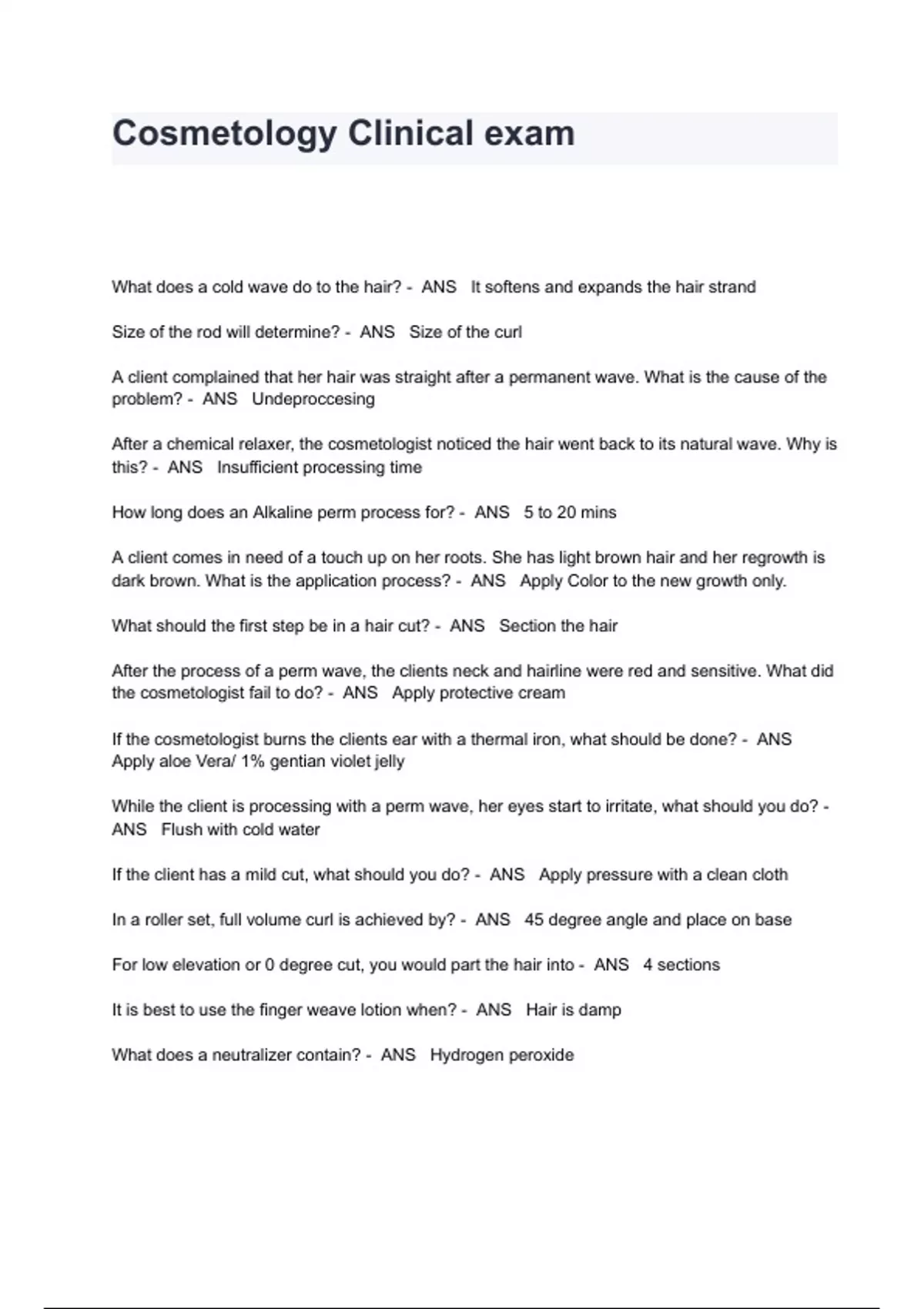Cosmetology Clinical Exam Questions And Answers What does a cold wave do to the hair? - ANS It softens and expands the hair strand Size of the rod will determine? - ANS Size of the curl A client complained that her hair was straight after a permanent wave. What is the cause of the problem? - ANS Undeproccesing After a chemical relaxer, the cosmetologist noticed the hair went back to its natural wave. Why is this? - ANS Insufficient processing time How long does an Alkaline perm process for? - ANS 5 to 20 mins A client comes in need of a touch up on her roots. She has light brown hair and her regrowth is dark brown. What is the application process? - ANS Apply Color to the new growth only. What should the first step be in a hair cut? - ANS Section the hair After the process of a perm wave, the clients neck and hairline were red and sensitive. What did the cosmetologist fail to do? - ANS Apply protective cream If the cosmetologist burns the clients ear with a thermal iron, what should be done? - ANS Apply aloe Vera/ 1% gentian violet jelly While the client is processing with a perm wave, her eyes start to irritate, what should you do? - ANS Flush with cold water If the client has a mild cut, what should you do? - ANS Apply pressure with a clean cloth In a roller set, full volume curl is achieved by? - ANS 45 degree angle and place on base For low elevation or 0 degree cut, you would part the hair into - ANS 4 sections It is best to use the finger weave lotion when? - ANS Hair is damp What does a neutralizer contain? - ANS Hydrogen peroxide