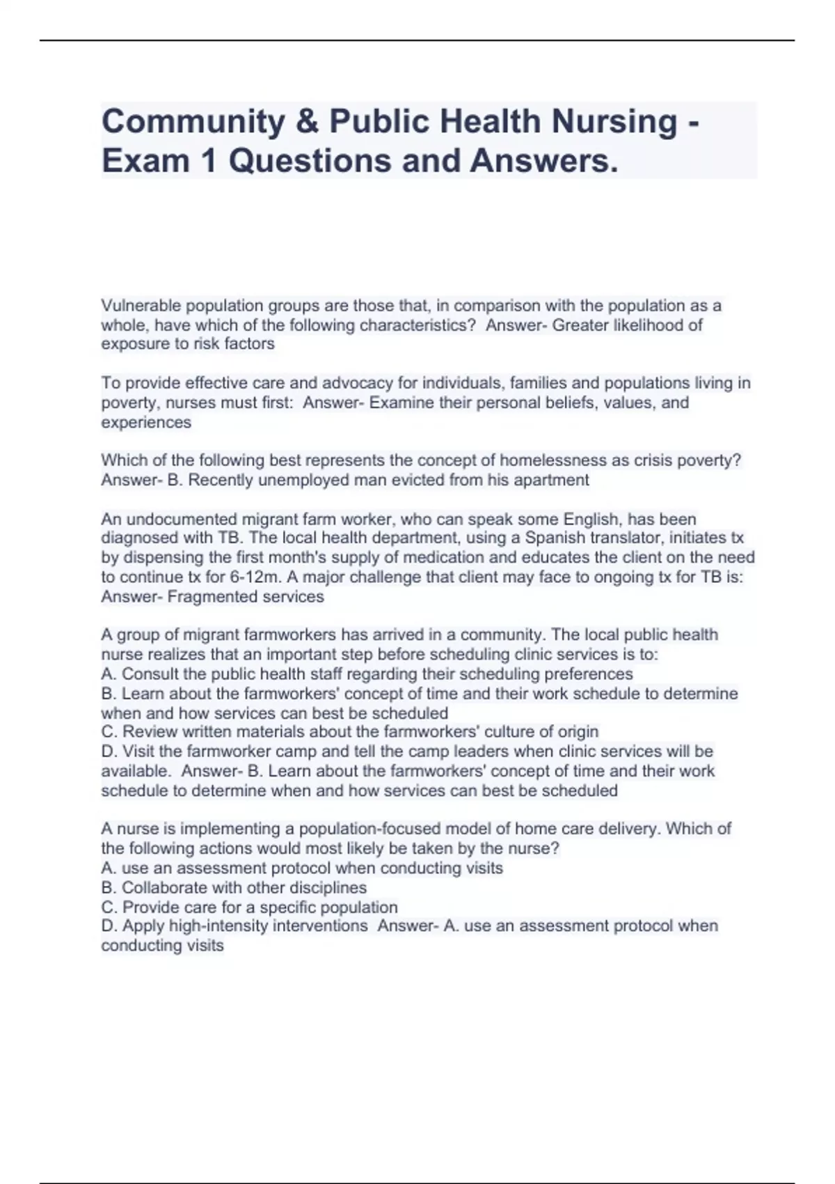 Community & Public Health Nursing - Exam 1 Questions and Answers