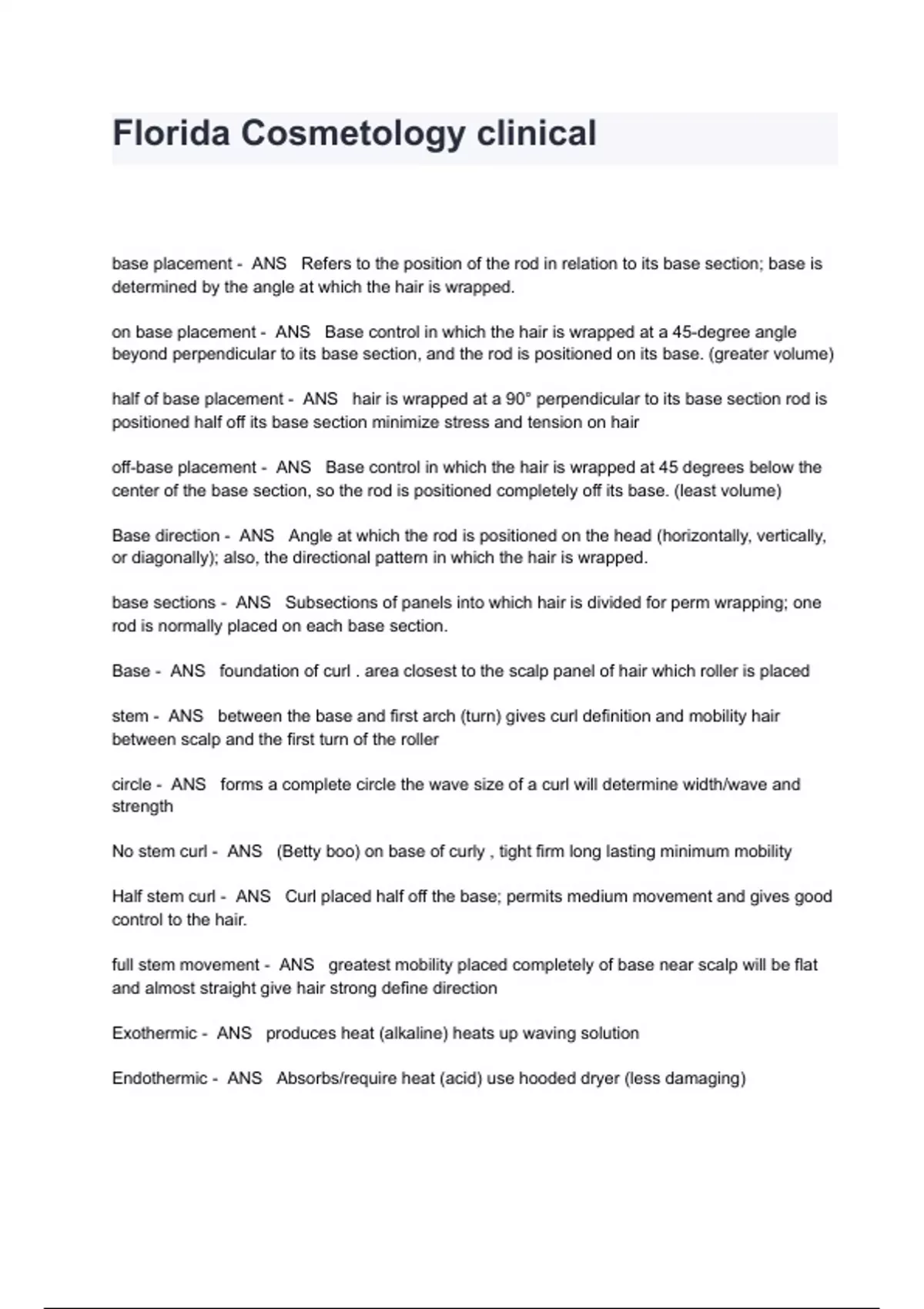 Florida Cosmetology clinical Exam Questions And Answers base placement - ANS Refers to the position of the rod in relation to its base section; base is determined by the angle at which the hair is wrapped. on base placement - ANS Base control in which the hair is wrapped at a 45-degree angle beyond perpendicular to its base section, and the rod is positioned on its base. (greater volume) half of base placement - ANS hair is wrapped at a 90° perpendicular to its base section rod is positioned half off its base section minimize stress and tension on hair off-base placement - ANS Base control in which the hair is wrapped at 45 degrees below the center of the base section, so the rod is positioned completely off its base. (least volume) Base direction - ANS Angle at which the rod is positioned on the head (horizontally, vertically, or diagonally); also, the directional pattern in which the hair is wrapped. base sections - ANS Subsections of panels into which hair is divided for perm wrapping; one rod is normally placed on each base section. Base - ANS foundation of curl . area closest to the scalp panel of hair which roller is placed stem - ANS between the base and first arch (turn) gives curl definition and mobility hair between scalp and the first turn of the roller circle - ANS forms a complete circle the wave size of a curl will determine width/wave and strength No stem curl - ANS (Betty boo) on base of curly , tight firm long lasting minimum mobility Half stem curl - ANS Curl placed half off the base; permits medium movement and gives good control to the hair. full stem movement - ANS greatest mobility placed completely of base near scalp will be flat and almost straight give hair strong define direction Exothermic - ANS produces heat (alkaline) heats up waving solution Endothermic - ANS Absorbs/require heat (acid) use hooded dryer (less damaging) ammonia-free waves - ANS Perms that use an ing