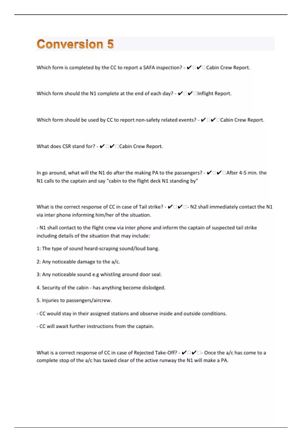 Which form is completed by the CC to report a SAFA inspection? - ️️Cabin Crew Report. Which form should the N1 complete at the end of each day? - ️️Inflight Report. Which form should be used by CC to report non-safety related events? - ️️Cabin Crew Report. What does CSR stand for? - ️️Cabin Crew Report. In go around, what will the N1 do after the making PA to the passengers? - ️️After 4-5 min. the N1 calls to the captain and say "cabin to the flight deck N1 standing by" What is the correct response of CC in case of Tail strike? - ️️- N2 shall immediately contact the N1 via inter phone informing him/her of the situation. - N1 shall contact to the flight crew via inter phone and inform the captain of suspected tail strike including details of the situation that may include: 1: The type of sound heard-scraping sound/loud bang. 2: Any noticeable damage to the a/c. 3: Any noticeable sound e.g whistling around door seal. 4. Security of the cabin - has anything become dislodged. 5. Injuries to passengers/aircrew. - CC would stay in their assigned stations and observe inside and outside conditions. - CC will await further instructions from the captain.