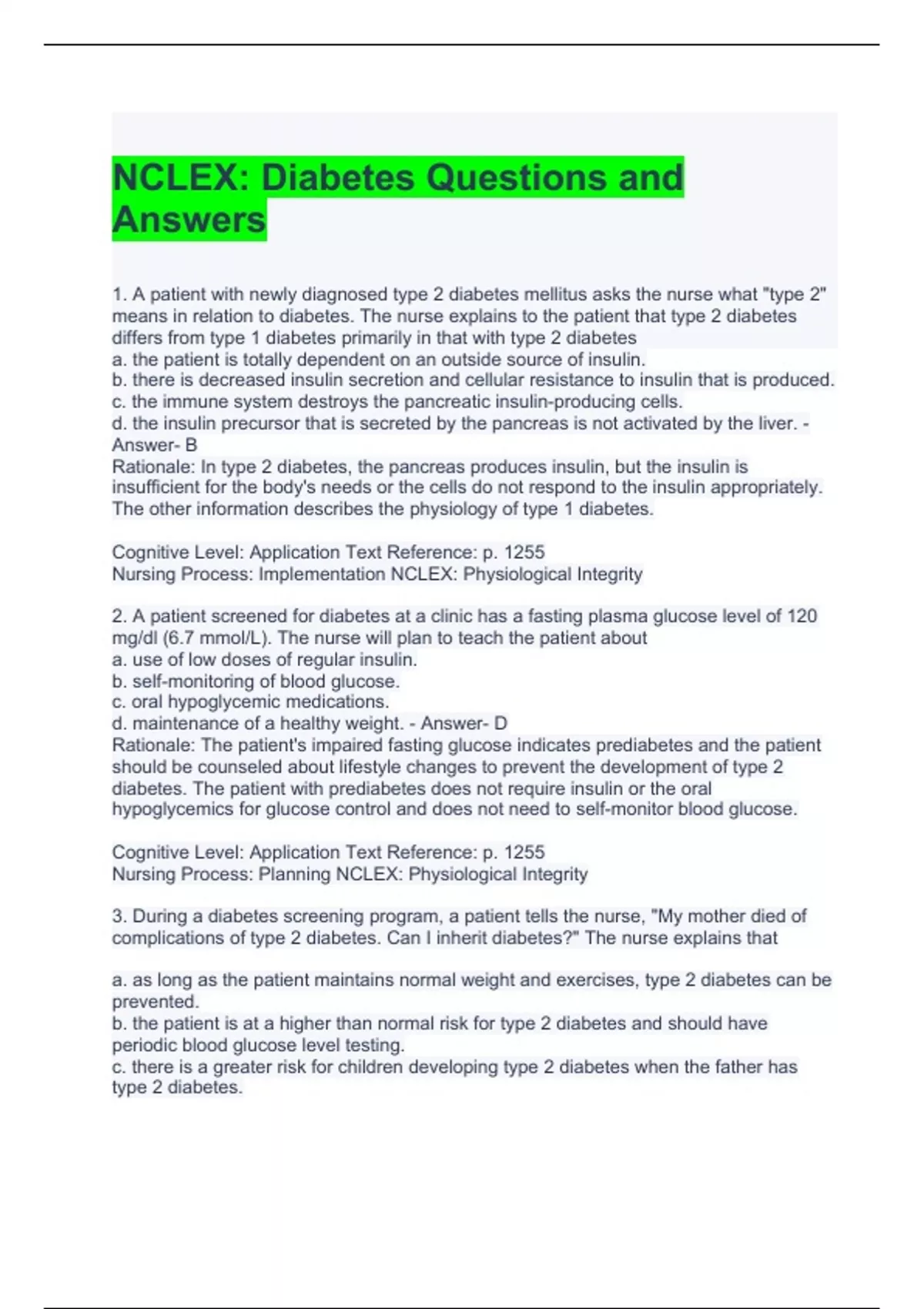 NCLEX Diabetes Questions and Answers | Graded A
