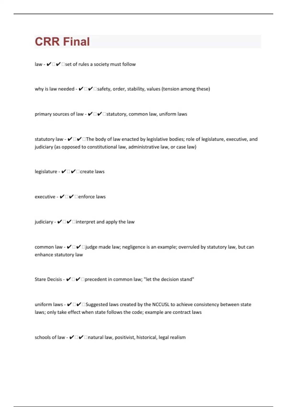 law - ️️set of rules a society must follow why is law needed - ️️safety, order, stability, values (tension among these) primary sources of law - ️️statutory, common law, uniform laws statutory law - ️️The body of law enacted by legislative bodies; role of legislature, executive, and judiciary (as opposed to constitutional law, administrative law, or case law) legislature - ️️create laws executive - ️️enforce laws judiciary - ️️interpret and apply the law common law - ️️judge made law; negligence is an example; overruled by statutory law, but can enhance statutory law Stare Decisis - ️️precedent in common law; "let the decision stand" uniform laws - ️️Suggested laws created by the NCCUSL to achieve consistency between state laws; only take effect when state follows the code; example are contract laws schools of law - ️️natural law, positivist, historical, legal realism