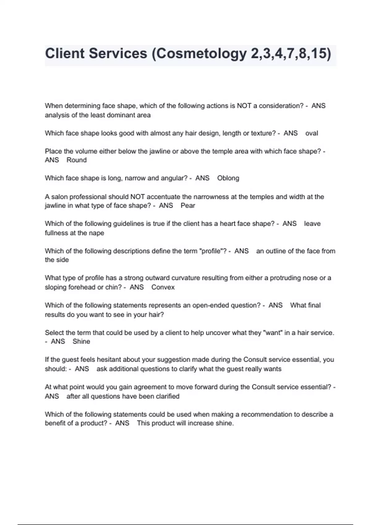 Client Services (Cosmetology 2,3,4,7,8,15) Exam Questions And Answers