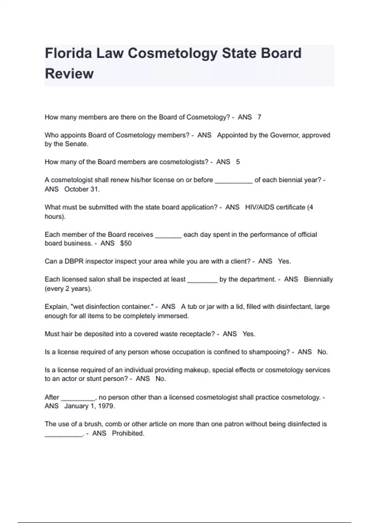 Florida Law Cosmetology State Board Review Exam Questions And Answers How many members are there on the Board of Cosmetology? - ANS 7 Who appoints Board of Cosmetology members? - ANS Appointed by the Governor, approved by the Senate. How many of the Board members are cosmetologists? - ANS 5 A cosmetologist shall renew his/her license on or before __________ of each biennial year? - ANS October 31. What must be submitted with the state board application? - ANS HIV/AIDS certificate (4 hours). Each member of the Board receives _______ each day spent in the performance of official board business. - ANS $50 Can a DBPR inspector inspect your area while you are with a client? - ANS Yes. Each licensed salon shall be inspected at least ________ by the department. - ANS Biennially (every 2 years). Explain, "wet disinfection container." - ANS A tub or jar with a lid, filled with disinfectant, large enough for all items to be completely immersed. Must hair be deposited into a covered waste receptacle? - ANS Yes. Is a license required of any person whose occupation is confined to shampooing? - ANS No. Is a license required of an individual providing makeup, special effects or cosmetology services to an actor or stunt person? - ANS No. After _________, no person other than a licensed cosmetologist shall practice cosmetology. - ANS January 1, 1979.