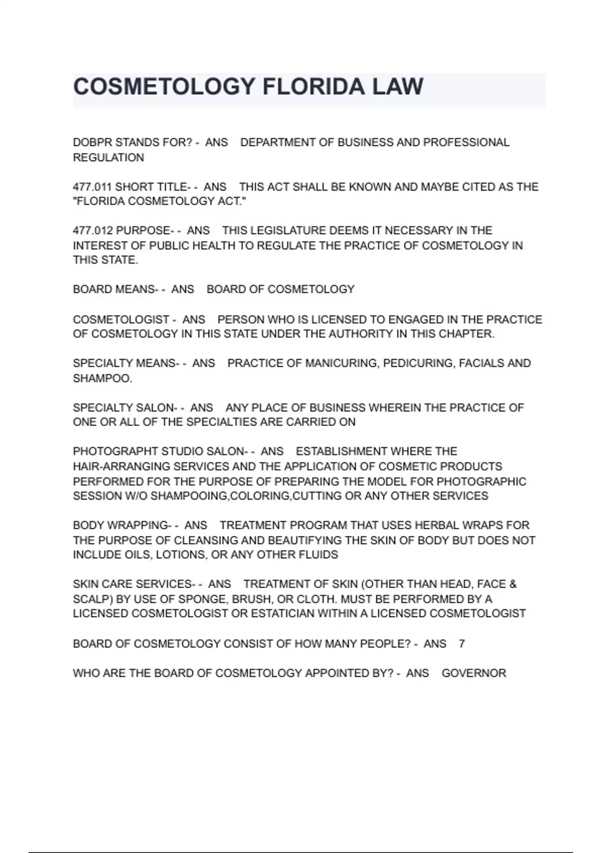 COSMETOLOGY FLORIDA LAW EXAM QUESTIONS AND ANSWERS DOBPR STANDS FOR? - ANS DEPARTMENT OF BUSINESS AND PROFESSIONAL REGULATION 477.011 SHORT TITLE- - ANS THIS ACT SHALL BE KNOWN AND MAYBE CITED AS THE "FLORIDA COSMETOLOGY ACT." 477.012 PURPOSE- - ANS THIS LEGISLATURE DEEMS IT NECESSARY IN THE INTEREST OF PUBLIC HEALTH TO REGULATE THE PRACTICE OF COSMETOLOGY IN THIS STATE. BOARD MEANS- - ANS BOARD OF COSMETOLOGY COSMETOLOGIST - ANS PERSON WHO IS LICENSED TO ENGAGED IN THE PRACTICE OF COSMETOLOGY IN THIS STATE UNDER THE AUTHORITY IN THIS CHAPTER. SPECIALTY MEANS- - ANS PRACTICE OF MANICURING, PEDICURING, FACIALS AND SHAMPOO. SPECIALTY SALON- - ANS ANY PLACE OF BUSINESS WHEREIN THE PRACTICE OF ONE OR ALL OF THE SPECIALTIES ARE CARRIED ON PHOTOGRAPHT STUDIO SALON- - ANS ESTAB