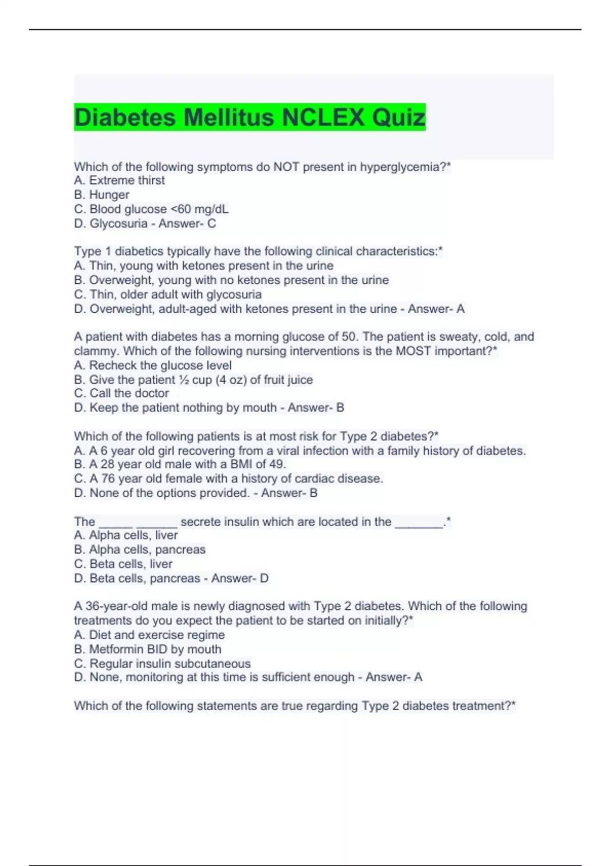 Diabetes Mellitus NCLEX Quiz with complete solutions