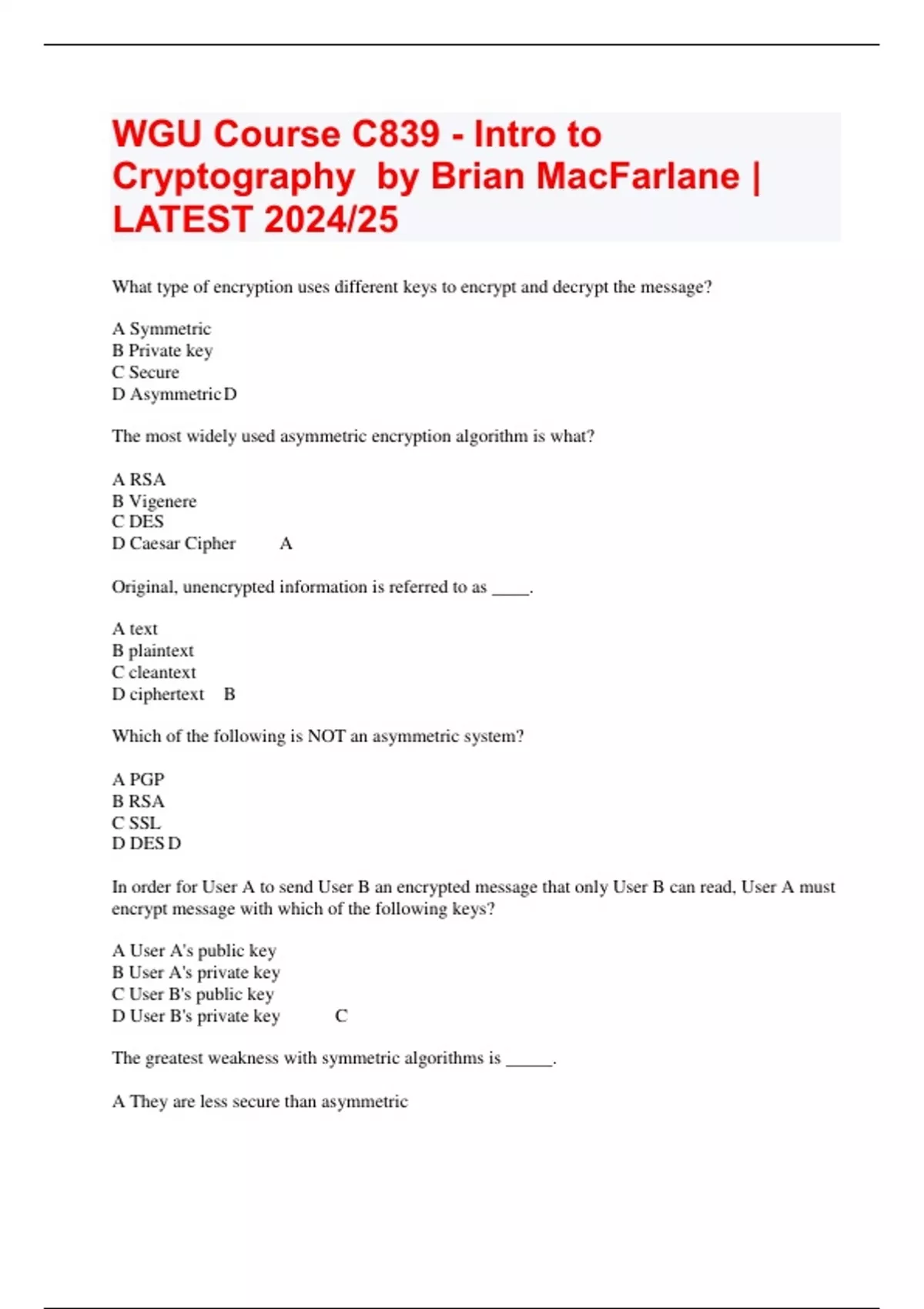 WGU Course C839 - Intro to Cryptography by Brian MacFarlane | LATEST 2024/25