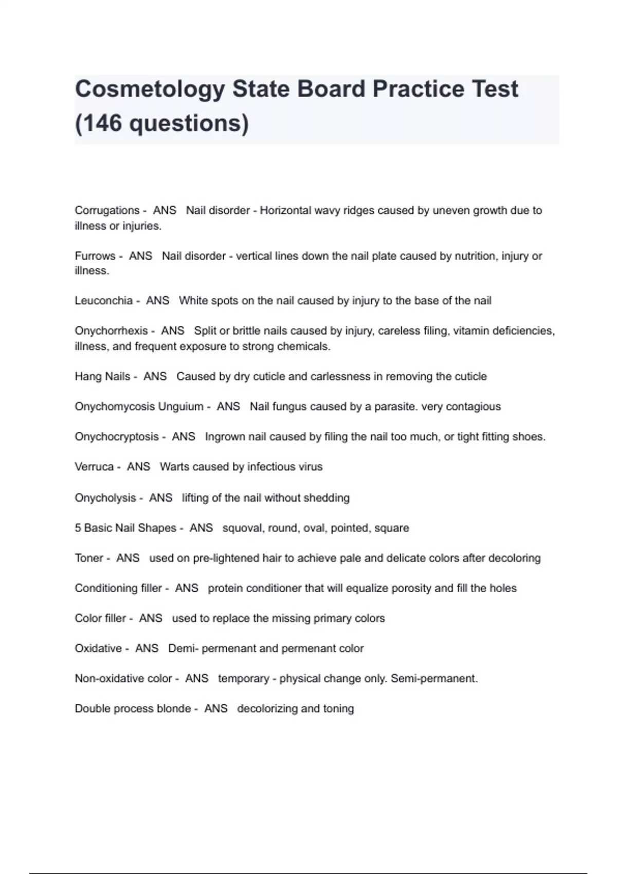 Cosmetology State Board Practice Test (146 questions) With Verified Answers Corrugations - ANS Nail disorder - Horizontal wavy ridges caused by uneven growth due to illness or injuries. Furrows - ANS Nail disorder - vertical lines down the nail plate caused by nutrition, injury or illness. Leuconchia - ANS White spots on the nail caused by injury to the base of the nail Onychorrhexis - ANS Split or brittle nails caused by injury, careless filing, vitamin deficiencies, illness, and frequent exposure to strong chemicals. Hang Nails - ANS Caused by dry cuticle and carlessness in removing the cuticle Onychomycosis Unguium - ANS Nail fungus caused by a parasite. very contagious Onychocryptosis - ANS Ingrown nail caused by filing the nail too much, or tight fitting shoes. Verruca - ANS Warts caused by infectious virus Onycholysis - ANS lifting of the nail without shedding 5 Basic Nail Shapes - ANS squoval, round, oval, pointed, square Toner - ANS used on pre-lightened hair to achieve pale and delicate colors after decoloring Conditioning filler - ANS protein conditioner that will equalize porosity and fill the holes Color filler - ANS used to replace the missing primary colors Oxidative - ANS Demi- permenant and permenant color Non-oxidative color - ANS temporary - physical change only. Semi-permanent. Double process blonde - ANS decolorizing and toning What affects lightener working time? - ANS Melanin - the more there is the longer the process. Scalp processes faster because of body heat Lift - ANS lightening by breaking up the melanin to decolorize hair Deposit - ANS means that product only deposits color because it does not contain ammonia or high alkalinity necessary to lift developer - ANS oxidizing agent H2O2 when mixed with ammonia it will break up the melanin and give ability to lift or lighten Semi-permanent color - ANS non-oxidative, temporary color, stains cuticle, fades in each shampoo. Demi-permanent color - ANS oxidative, deposit only, deepens or changes the tone Permanent color - ANS lightens and deposits at the same time. more alkaline ingredients, penetrates the cortex, can't shampoo out Primary colors - ANS Red, Blue, Yellow Brown - ANS unequal combo of primary color Black - ANS Equal parts of primary colors Warm tones - ANS red, orange, yellow Cool tones - ANS blue, green, violet Neutral tones - ANS perfect combo of both cool and warm tones Eumelanin - ANS Brown to black pigments Pheomelanin - ANS Red to yellow pigments Coarse texture - ANS largest diameter, greatest amount of melanin, processing time and lift is affected medium texture - ANS has a balance of melanin, typically no problems Fine texture - ANS smallest diameter, least amount of melanin, more susceptible to darker drabber results, more prone to damage Alkaline Wave - ANS AKA cold waves - ammonium thioglycolate (thio and ammonia). ph - 9.0-9.6, no tension, solution causes hair to swell, processes at RT Acid Wave - ANS AKA heat waves- glycerol monothioglycolate. ph - 7.8-8.2. will require heat to speed processing Endothermic - ANS required added heat source Exothermic - ANS self heating Croguiqnole - ANS Wrapping technique from ends to scalp, causes tighter curls on ends. also referred to as "overlapping method" Spiral - ANS hair is not perpendicular to rod - spiraled from top-bottom of rod On base placement - ANS hair is held 45* forward 1/2 off base placement - ANS hair is held 90* straight up Off base placement - ANS hair is held 45* down End paper techniques - ANS double flat, bookend, cushion wrap Lanthionization - ANS hydroxide relaxer removes 1 of the sulfer atoms converting from a disulfide bond converting it into a lanthionine bond, which is only 1 sulfur atom. can never be reformed