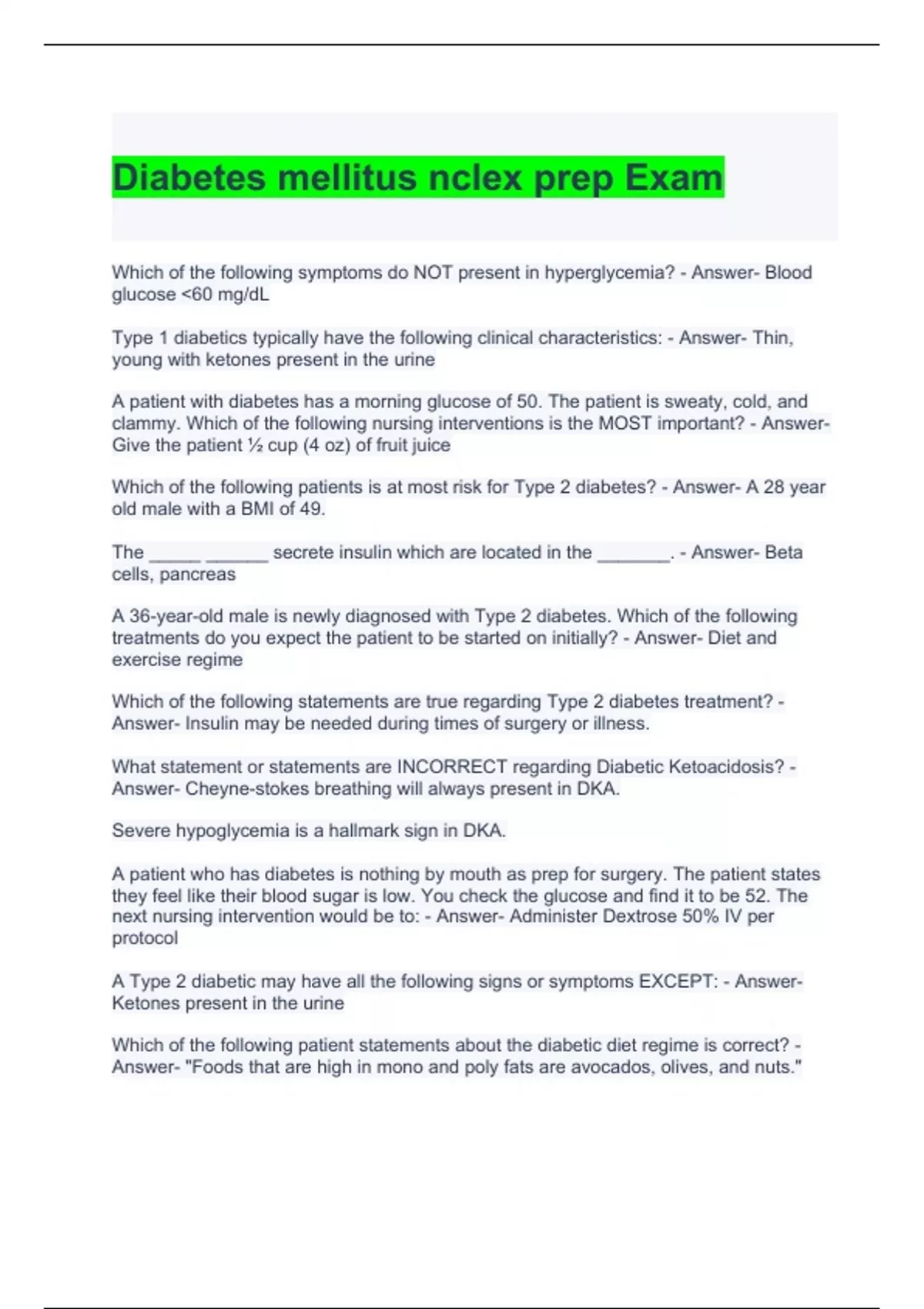 Diabetes mellitus nclex prep Exam Questions and Answers