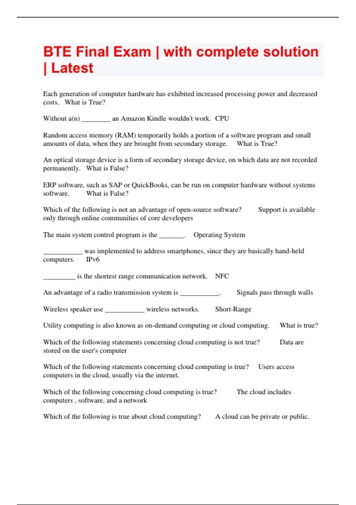 bte final exam with complete solution latest