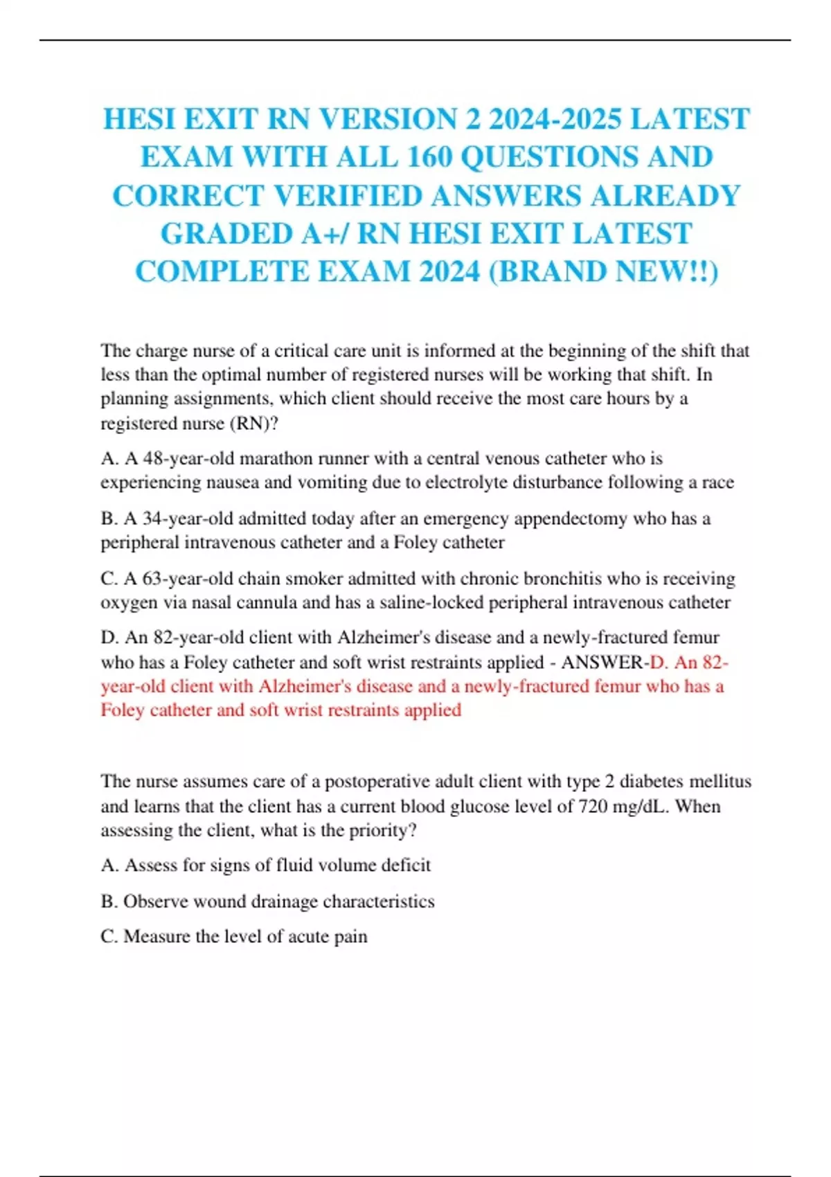 HESI EXIT RN VERSION LATEST EXAM WITH ALL 160 QUESTIONS AND CORRECT VERIFIED ANSWERS ALREADY GRADED A+/ RN HESI EXIT LATEST COMPLETE EXAM 2024 (BRAND NEW!!)