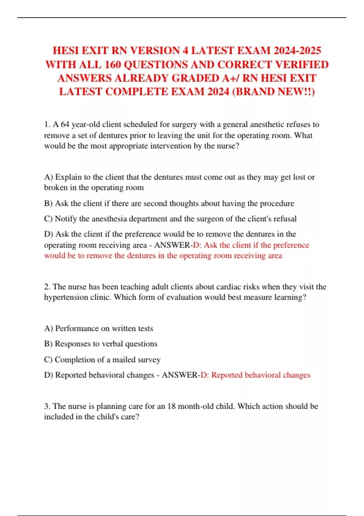 HESI EXIT RN VERSION 4 LATEST EXAM WITH ALL 160 QUESTIONS AND CORRECT VERIFIED ANSWERS ALREADY GRADED A+/ RN HESI EXIT LATEST COMPLETE EXAM 2024 (BRAND NEW!!)