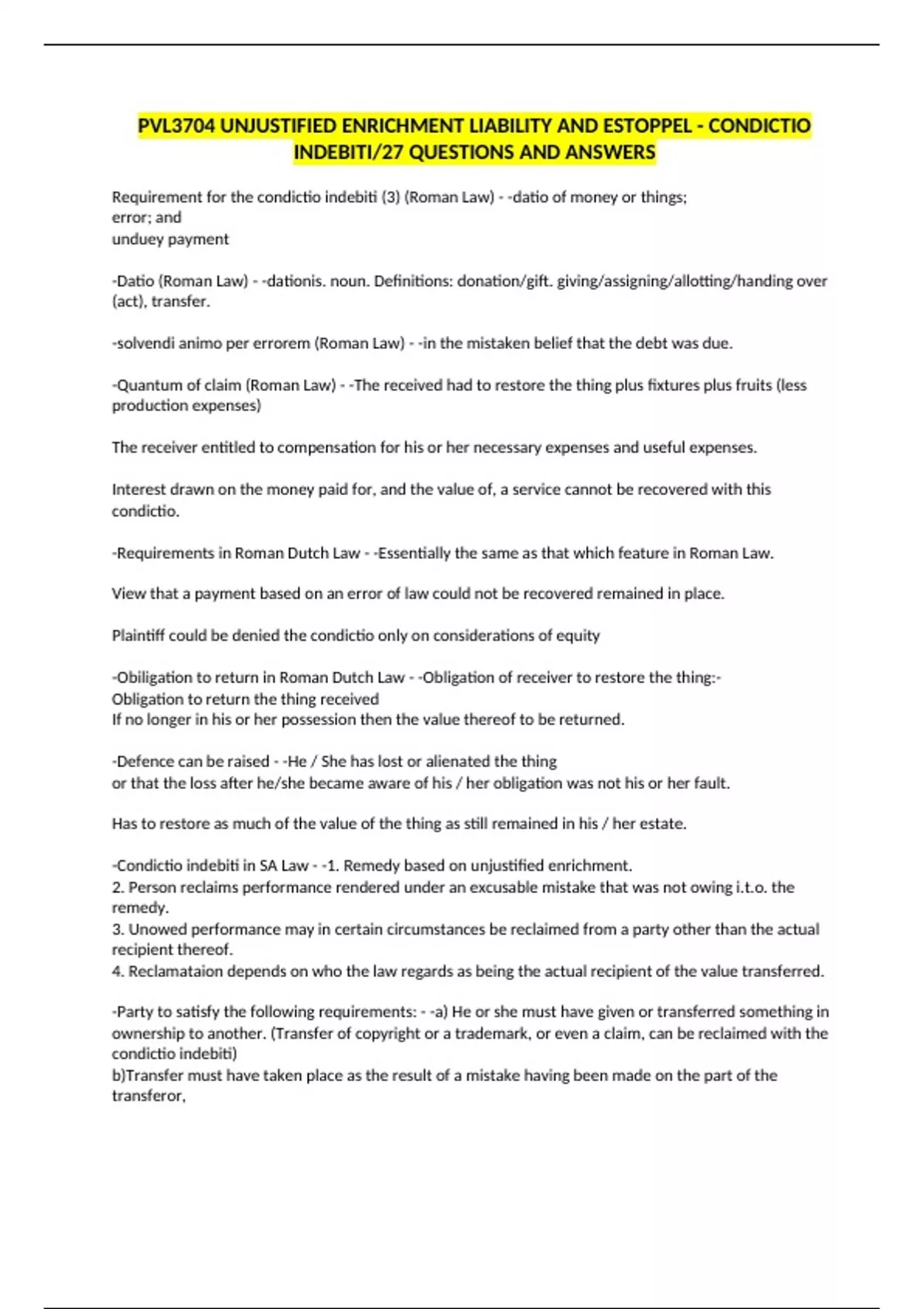 PVL3704 UNJUSTIFIED ENRICHMENT LIABILITY AND ESTOPPEL - CONDICTIO INDEBITI/27 QUESTIONS AND ANSWERS