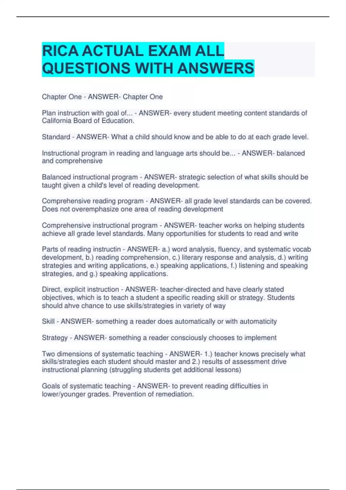 RICA ACTUAL EXAM ALL QUESTIONS WITH ANSWERS Chapter One - ANSWER- Chapter One Plan instruction with goal of... - ANSWER- every student meeting content standards of California Board of Education. Standard - ANSWER- What a child should know and be able to do at each grade level. Instructional program in reading and language arts should be... - ANSWER- balanced and comprehensive Balanced instructional program - ANSWER- strategic selection of what skills should be taught given a child's level of reading development. Comprehensive reading program - ANSWER- all grade level standards can be covered. Does not overemphasize one area of reading development Comprehensive instructional program - ANSWER- teacher works on helping students achieve all grade level standards. Many opportunities for students to read and write Parts of reading instructin - ANSWER- a.) word analysis, fluency, and systematic vocab development, b.) reading comprehension, c.) literary response and analysis, d.) writing strategies and writing applications, e.) speaking applications, f.) listening and speaking strategies, and g.) speaking applications. Direct, explicit instruction - ANSWER- teacher-directed and have clearly stated objectives, which is to teach a student a specific reading skill or strategy. Students should ahve chance to use skills/strategies in variety of way Skill - ANSWER- something a reader does automatically or with automaticity Strategy - ANSWER- something a reader consciously chooses to implement Two dimensions of systematic teaching - ANSWER- 1.) teacher knows precisely what skills/strategies each student should master and 2.) results of assessment drive instructional planning (struggling students get additional lessons) Goals of systematic teaching - ANSWER- to prevent reading difficulties in lower/younger grades. Prevention of remediation. Early intervention programs - ANSWER- focus on youngest readers who are having difficulties at the earliest possible opportunity. Differentiated Instruction - ANSWER- meet individual differences. struggling students, ELLs, and advanced students. Small group lessons. Different strategies for different groups of students. Different resources and materials for different groups of students. Long-term Goals - ANSWER- For school year. Organized for each month. Teacher plans time to cover all standards. Goal achieved through several lessons with small number of learning objectives. Short-tern goals - ANSWER- Brief period. Week or two. Ex: have students compare and contrast elements of two or more stories. Teachers must use evidence to prove learning objectives met. Paper/Pen and observations acceptable evidence. Key factors in differentiated reading instruction - ANSWER- consider: students' knowledge and skills, prerequisite knowledge and skills, pacing of instruction, complexity of skills/content to be presented, and scaffolds. Flexible grouping - ANSWER- groups formed to teach one skill and then disbanded once particular goal is met. Homogeneous grouping - ANSWER- Children in group have same ability Basal reading programs - ANSWER- CA state board of education (SBE) reading, ELA program. Feature teacher's manual, student text (basal reader), student workbooks, supplemental books, CDs with additional resources, and assessment resources. Must have programs for struggling readers, advanced readers, and ELLs. Benchmark, strategic, and intensive groups - ANSWER- benchmark = small difficulty; strategic = 1 or 2 years behind. special lessons required for students; intensive groups = more than two years behind. special resources. highest level of differentiation. slower paced lessons. more manageable chunks of instruction. Components of effective instructional delivery - ANSWER- orientation, presentation, structured and guided practices, and independent practice and application. Book clubs - ANSWER- small, formal groups of students assigned by teacher who read same book. Students meet while reading and immediately after reading. Teacher helps starts discussion, but students should do most of it. Can give roles to students (moderator, vocab, etc.) Literature circles - ANSWER- small group discussion. Students select what they read and all read same book. Author studies - ANSWER- teacher assigns group of students to read books or works by author of children's literature. Read more than one work by author. Students present talks on author and works as a group. Promoting and monitoring independent reading - ANSWER- Should be self selected and self monitored/paced. Tell children to pick books at their reading level (not too easy or too hard - Goldilocks) 5 words too hard on a page, too difficult. Interest inventories - ANSWER- Students more likely to read if they have texts they like. Used to determine students interests and how much the child enjoys reading. Interpret results to suggest books to students. I + I Strategy - ANSWER- independent reading level + personal interest = best chance of success Independent reading opportunities in class - ANSWER- SSR (sustained silent reading); Readers' Workshop, at home reading (hold students and parents accountable) Methods for monitoring student independent reading - ANSWER- student-maintained reading logs, books reports, formal and informal oral presentations, individual conferences. Promoting skillful teaching of reading - ANSWER- reading coaches/literary coaches, grade-level meetings, professional development Chapter Two - ANSWER- Chapter Two Primary purposes of reading assessments - ANSWER- entry-level, monitoring of progress, and summative assessments Entry-level assessments - ANSWER- implemented prior to instruction to determine students' prerequisite skills and knowledge. Progress-monitoring assessments - ANSWER- take place during instruction unit. tell teacher what students are making adequate, advanced, or slow progress. Summative Assessments - ANSWER- determine if students have met standard. Can be given to measure achievement of sing