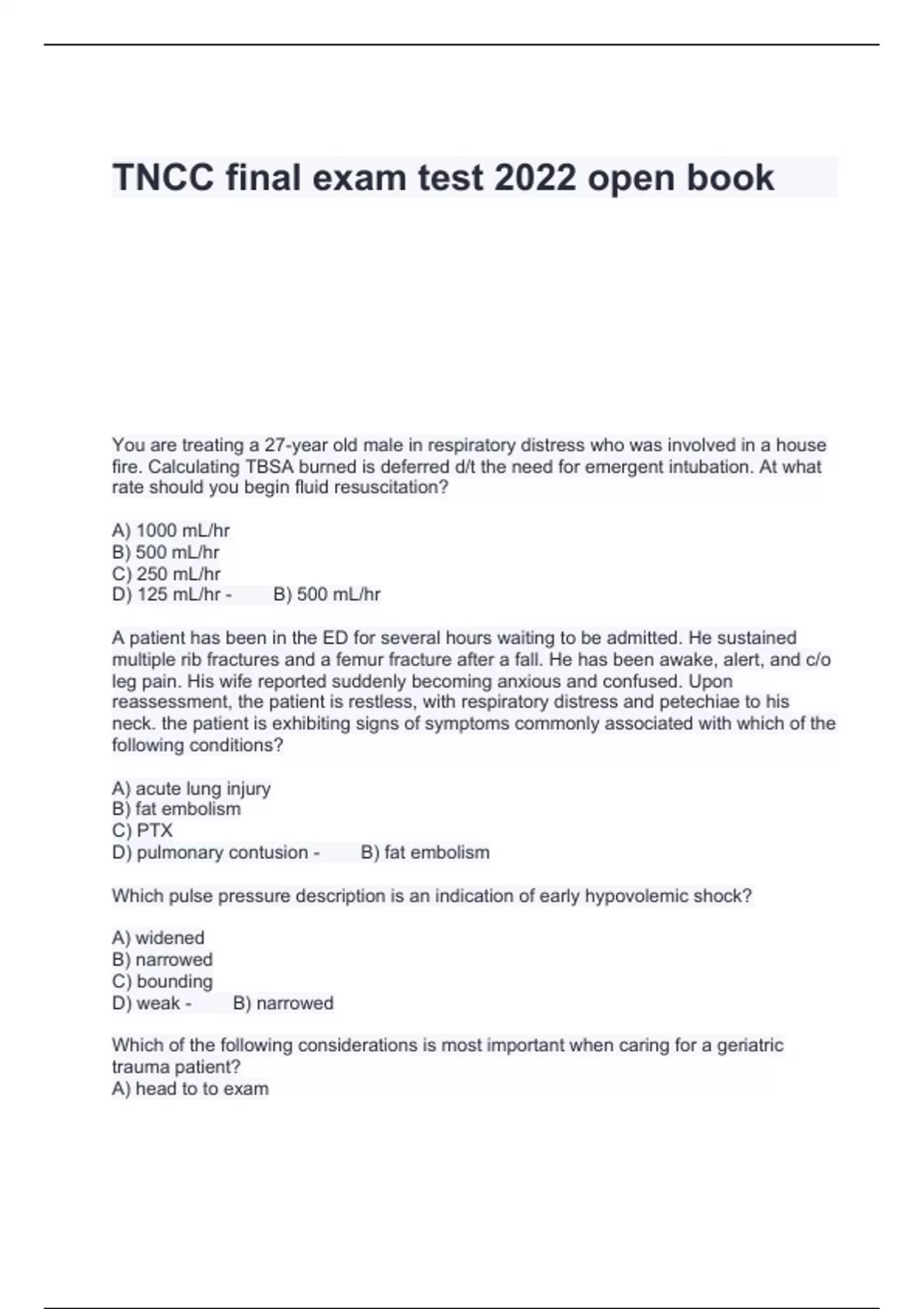 You are treating a 27-year old male in respiratory distress who was involved in a house fire. Calculating TBSA burned is deferred d/t the need for emergent intubation. At what rate should you begin fluid resuscitation? A) 1000 mL/hr B) 500 mL/hr C) 250 mL/hr D) 125 mL/hr - B) 500 mL/hr A patient has been in the ED for several hours waiting to be admitted. He sustained multiple rib fractures and a femur fracture after a fall. He has been awake, alert, and c/o leg pain. His wife reported suddenly becoming anxious and confused. Upon reassessment, the patient is restless, with respiratory distress and petechiae to his neck. the patient is exhibiting signs of symptoms commonly associated with which of the following conditions? A) acute lung injury B) fat embolism C) PTX D) pulmonary contusion - B) fat embolism Which pulse pressure description is an indication of early hypovolemic shock? A) widened B) narrowed C) bounding D) weak - B) narrowed Which of the following considerations is most important when caring for a geriatric trauma patient? A) head to to exam