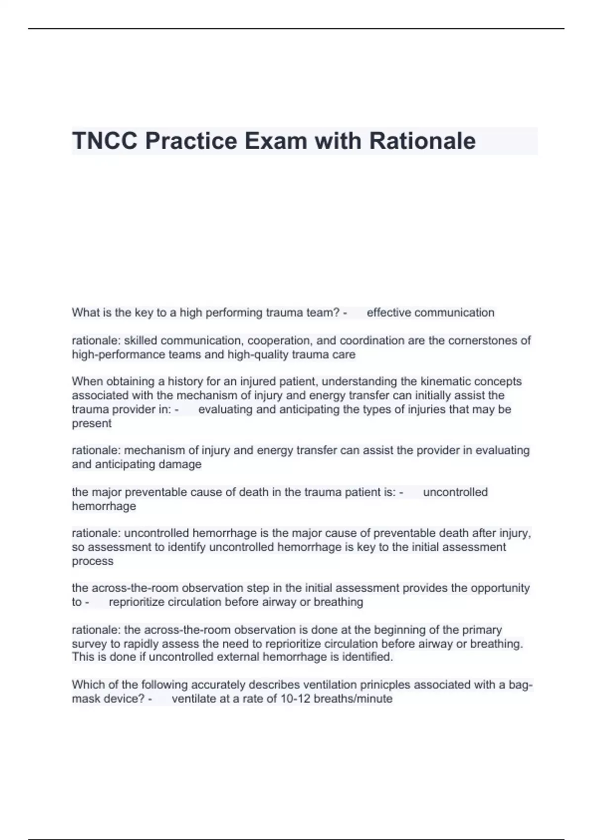 What is the key to a high performing trauma team? - effective communication rationale: skilled communication, cooperation, and coordination are the cornerstones of high-performance teams and high-quality trauma care When obtaining a history for an injured patient, understanding the kinematic concepts associated with the mechanism of injury and energy transfer can initially assist the trauma provider in: - evaluating and anticipating the types of injuries that may be present rationale: mechanism of injury and energy transfer can assist the provider in evaluating and anticipating damage the major preventable cause of death in the trauma patient is: - uncontrolled hemorrhage rationale: uncontrolled hemorrhage is the major cause of preventable death after injury, so assessment to identify uncontrolled hemorrhage is key to the initial assessment process the across-the-room observation step in the initial assessment provides the opportunity to - reprioritize circulation before airway or breathing rationale: the across-the-room observation is done at the beginning of the primary survey to rapidly assess the need to reprioritize circulation before airway or breathing. This is done if uncontrolled external hemorrhage is identified. Which of the following accurately describes ventilation prinicples associated with a bag-mask device? - ventilate at a rate of 10-12 breaths/minute