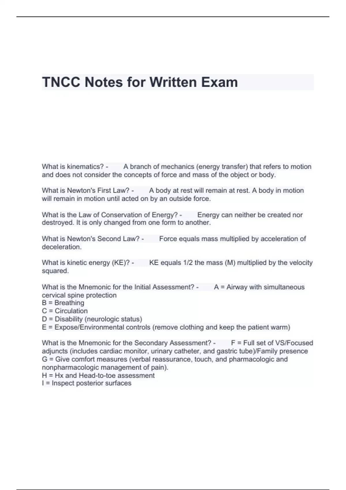 What is kinematics? - A branch of mechanics (energy transfer) that refers to motion and does not consider the concepts of force and mass of the object or body. What is Newton's First Law? - A body at rest will remain at rest. A body in motion will remain in motion until acted on by an outside force. What is the Law of Conservation of Energy? - Energy can neither be created nor destroyed. It is only changed from one form to another. What is Newton's Second Law? - Force equals mass multiplied by acceleration of deceleration. What is kinetic energy (KE)? - KE equals 1/2 the mass (M) multiplied by the velocity squared. What is the Mnemonic for the Initial Assessment? - A = Airway with simultaneous cervical spine protection B = Breathing C = Circulation D = Disability (neurologic status) E = Expose/Environmental controls (remove clothing and keep the patient warm) What is the Mnemonic for the Secondary Assessment? - F = Full set of VS/Focused adjuncts (includes cardiac monitor, urinary catheter, and gastric tube)/Family presence G = Give comfort measures (verbal reassurance, touch, and pharmacologic and nonpharmacologic management of pain). H = Hx and Head-to-toe assessment I = Inspect posterior surfaces
