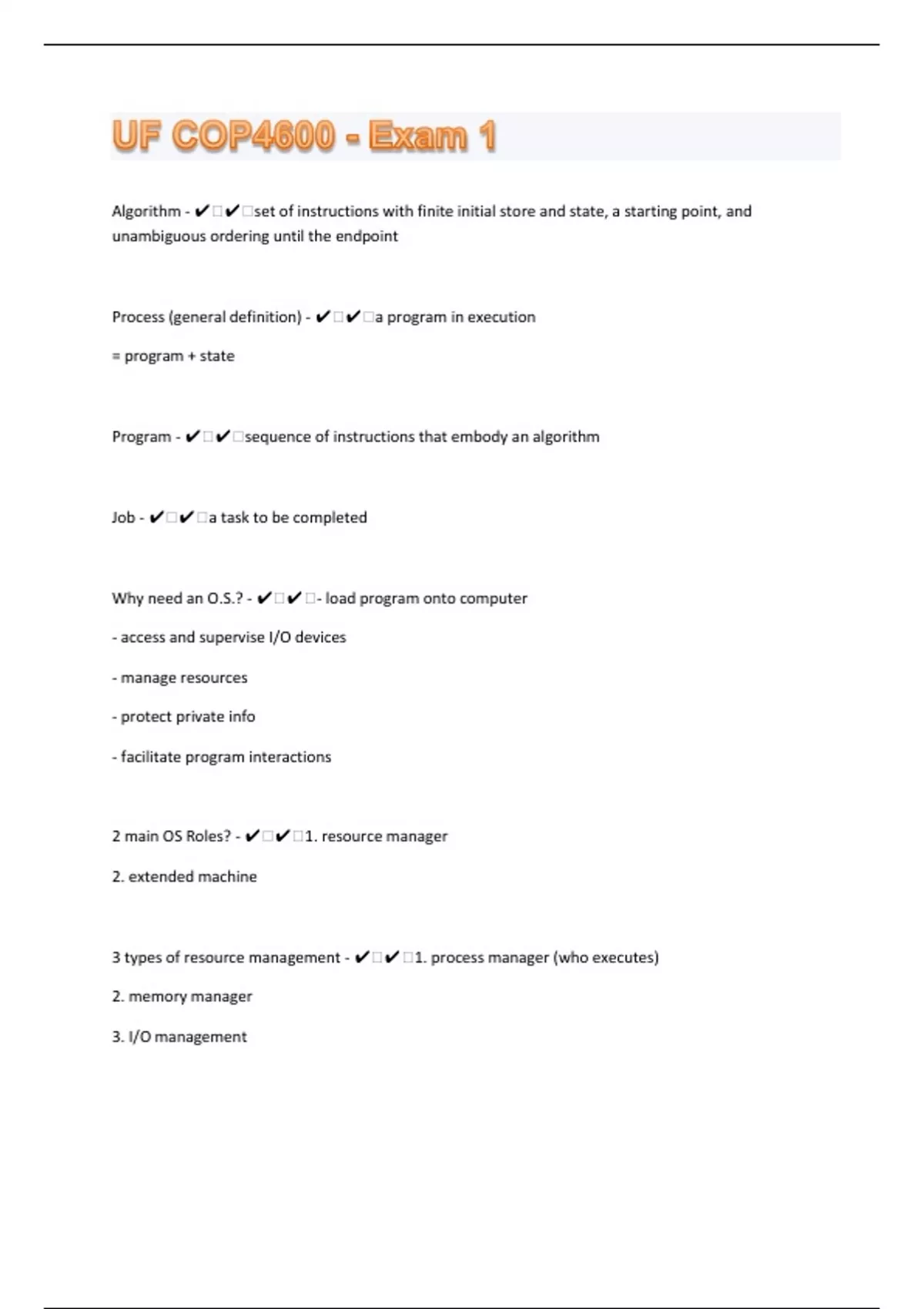 Algorithm - ️️set of instructions with finite initial store and state, a starting point, and unambiguous ordering until the endpoint Process (general definition) - ️️a program in execution = program + state Program - ️️sequence of instructions that embody an algorithm Job - ️️a task to be completed Why need an O.S.? - ️️- load program onto computer - access and supervise I/O devices - manage resources - protect private info - facilitate program interactions 2 main OS Roles? - ️️1. resource manager 2. extended machine 3 types of resource management - ️️1. process manager (who executes) 2. memory manager 3. I/O management