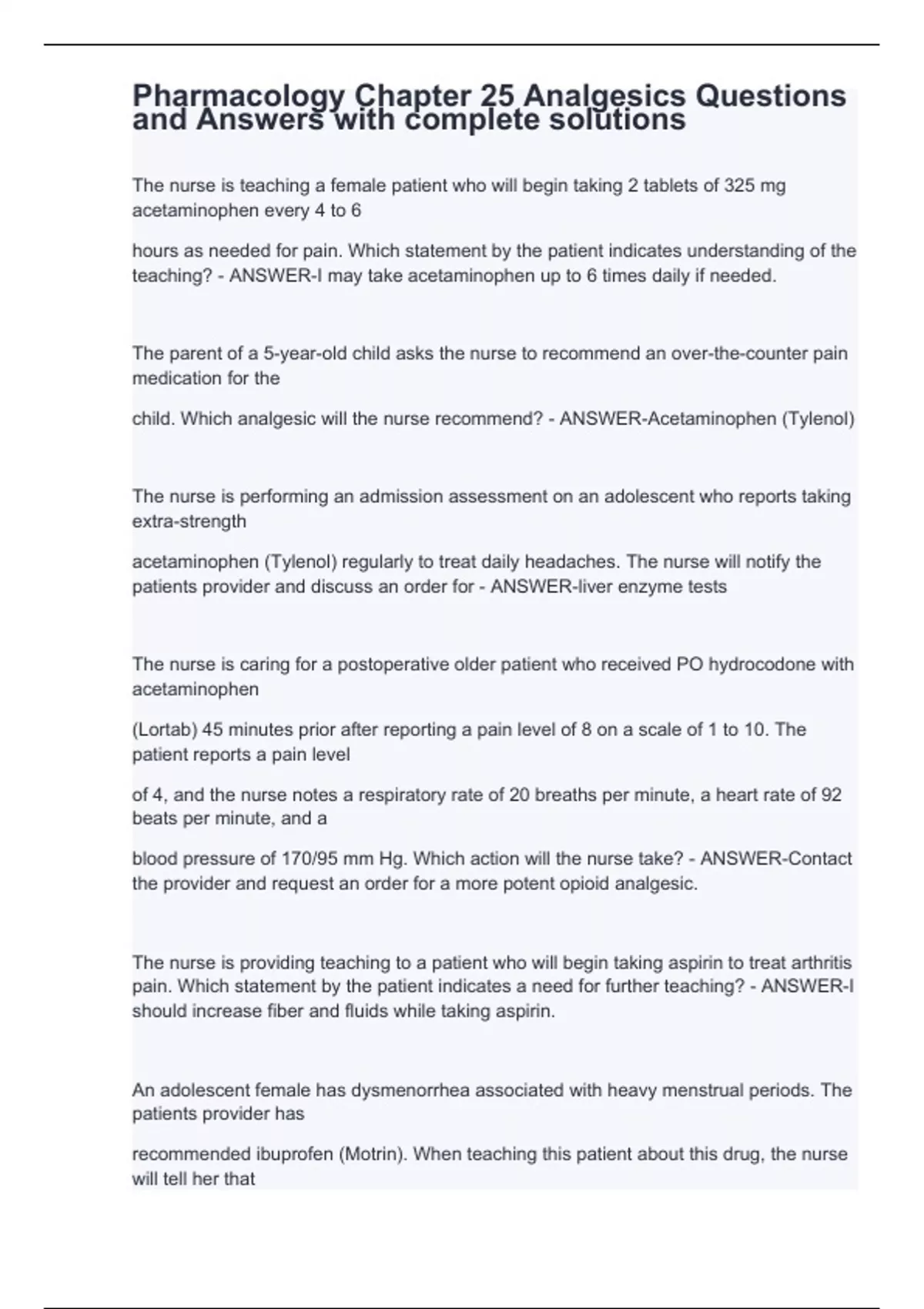 The nurse is teaching a female patient who will begin taking 2 tablets of 325 mg acetaminophen every 4 to 6 hours as needed for pain. Which statement by the patient indicates understanding of the teaching? - ANSWER-I may take acetaminophen up to 6 times daily if needed. The parent of a 5-year-old child asks the nurse to recommend an over-the-counter pain medication for the child. Which analgesic will the nurse recommend? - ANSWER-Acetaminophen (Tylenol) The nurse is performing an admission assessment on an adolescent who reports taking extra-strength acetaminophen (Tylenol) regularly to treat daily headaches. The nurse will notify the patients provider and discuss an order for - ANSWER-liver enzyme tests The nurse is caring for a postoperative older patient who received PO hydrocodone with acetaminophen (Lortab) 45 minutes prior after reporting a pain level of 8 on a scale of 1 to 10. The patient reports a pain level of 4, and the nurse notes a respiratory rate of 20 breaths per minute, a heart rate of 92 beats per minute, and a blood pressure of 170/95 mm Hg. Which action will the nurse take? - ANSWER-Contact the provider and request an order for a more potent opioid analgesic. The nurse is providing teaching to a patient who will begin taking aspirin to treat arthritis pain. Which statement by the patient indicates a need for further teaching? - ANSWER-I should increase fiber and fluids while taking aspirin. An adolescent female has dysmenorrhea associated with heavy menstrual periods. The patients provider has recommended ibuprofen (Motrin). When teaching this patient about this drug, the nurse will tell her that ibuprofen - ANSWER-may increase bleeding during her period.