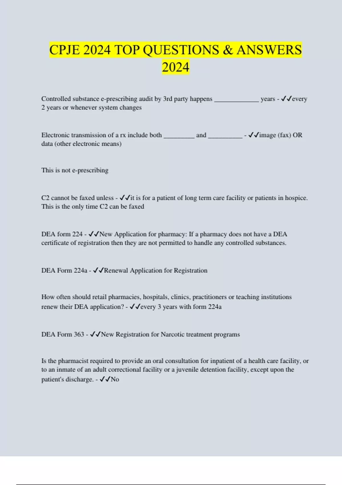 Controlled substance e-prescribing audit by 3rd party happens _____________ years - every 2 years or whenever system changes Electronic transmission of a rx include both _________ and __________ - image (fax) OR data (other electronic means) This is not e-prescribing C2 cannot be faxed unless - it is for a patient of long term care facility or patients in hospice. This is the only time C2 can be faxed DEA form 224 - New Application for pharmacy: If a pharmacy does not have a DEA certificate of registration then they are not permitted to handle any controlled substances. DEA Form 224a - Renewal Application for Registration How often should retail pharmacies, hospitals, clinics, practitioners or teaching institutions renew their DEA application? - every 3 years with form 224a DEA Form 363 - New Registration for Narcotic treatment programs Is the pharmacist required to provide an oral consultation for inpatient of a health care facility, or to an inmate of an adult correctional facility or a juvenile detention facility, except upon the patient's discharge. - N