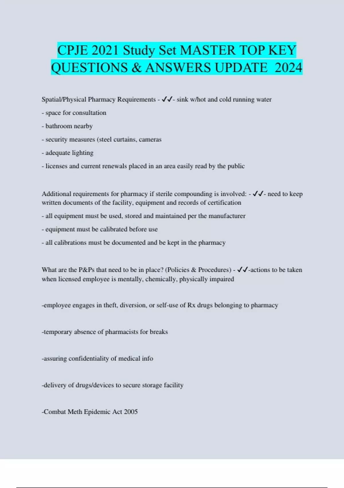 Spatial/Physical Pharmacy Requirements - - sink w/hot and cold running water - space for consultation - bathroom nearby - security measures (steel curtains, cameras - adequate lighting - licenses and current renewals placed in an area easily read by the public Additional requirements for pharmacy if sterile compounding is involved: - - need to keep written documents of the facility, equipment and records of certification - all equipment must be used, stored and maintained per the manufacturer - equipment must be calibrated before use - all calibrations must be documented and be kept in the pharmacy What are the P&Ps that need to be in place? (Policies & Procedures) - -actions to be taken when licensed employee is mentally, chemically, physically impaired -employee engages in theft, diversion, or self-use of Rx drugs belonging to pharmacy -temporary absence of pharmacists for breaks -assuring confidentiality of medical info -delivery of drugs/devices to secure storage facility -Combat Meth Epidemic Act 2005
