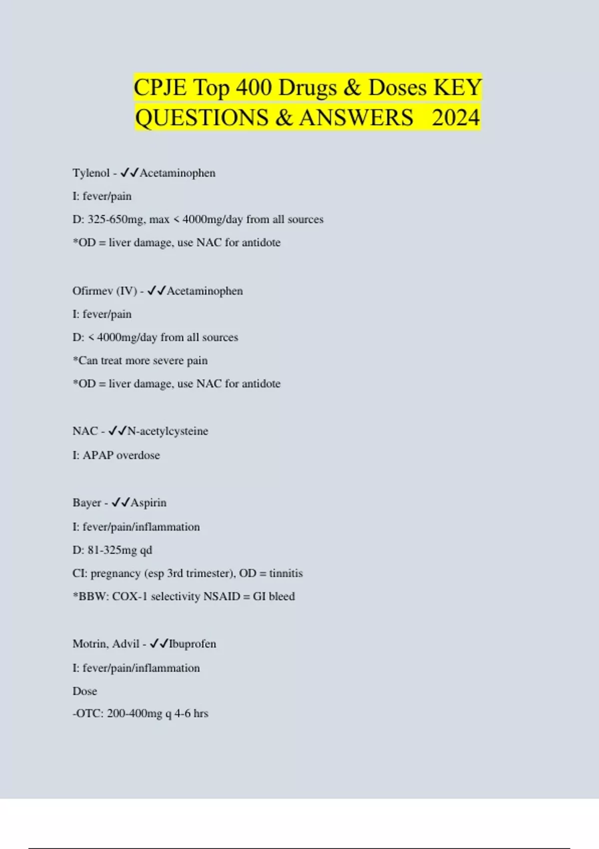 CPJE Top 400 Drugs & Doses KEY QUESTIONS & ANSWERS 2024